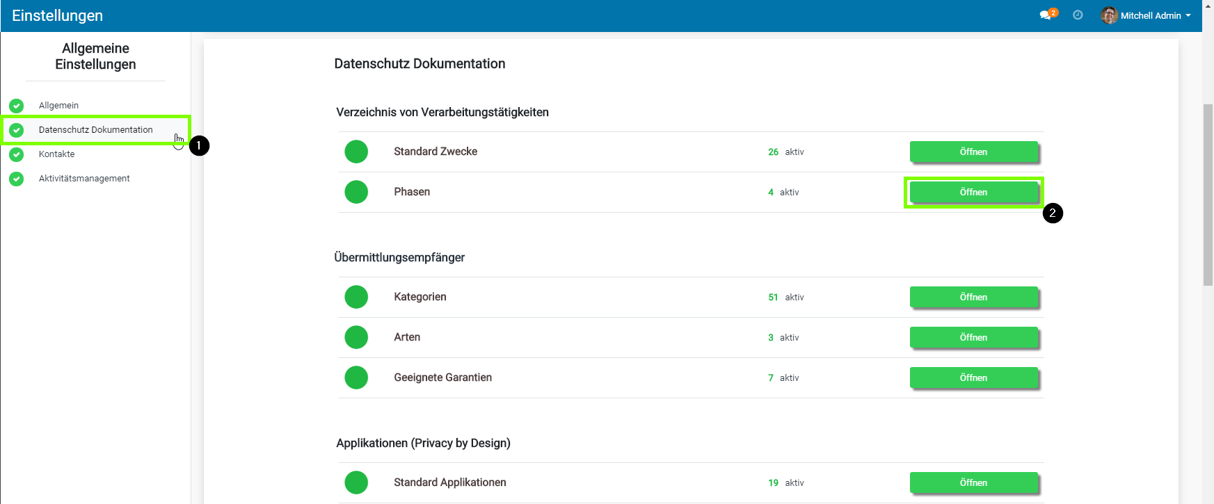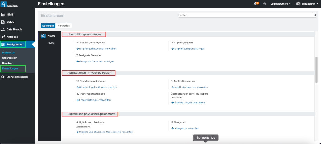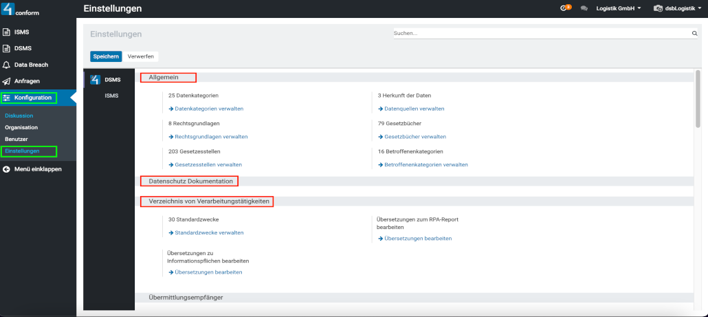- Datenschutz-Dokumentations-Einstellungen (welche folgende Untergruppen besitzen):