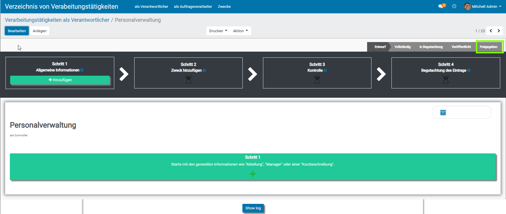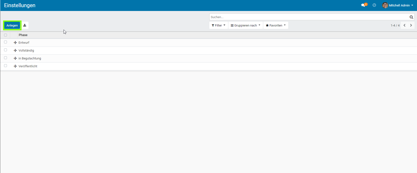 - Klicken Sie auf „Anlegen“ , um in diesem Fall eine neue Phase im Verzeichnis der Verarbeitungstätigkeiten zu erstellen.