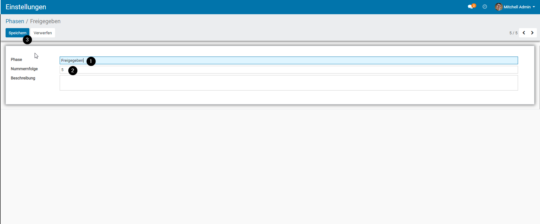 - Geben Sie der Phase einen Namen. Bestimmen Sie welche Nummernfolge die Phase haben soll. Optional können Sie die Phase noch beschreiben.