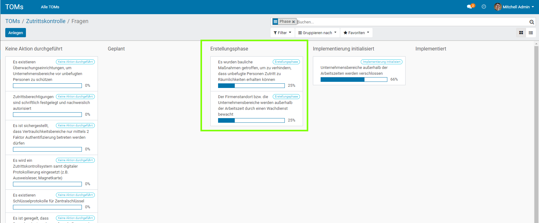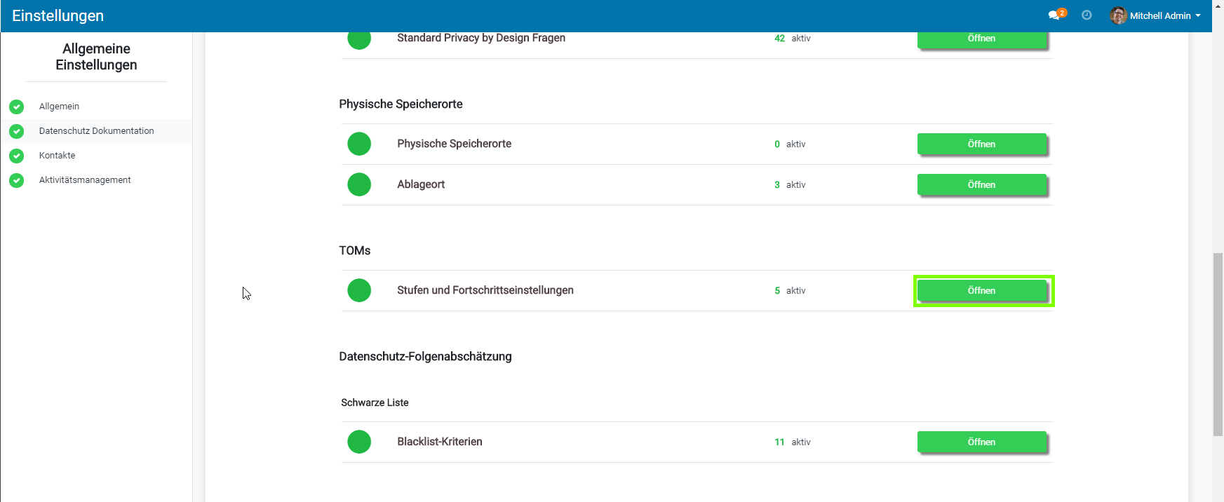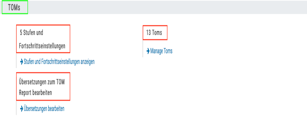 In der Gruppe „technische und organisatorischen Maßnahmen (TOMs)“ , finden Sie die Einstellungen um „Stufen und Fortschrittseinstellungen“ , „Übersetzungen zum TOM Report“ und „die TOMs“ , zu verwalten und zu bearbeiten.