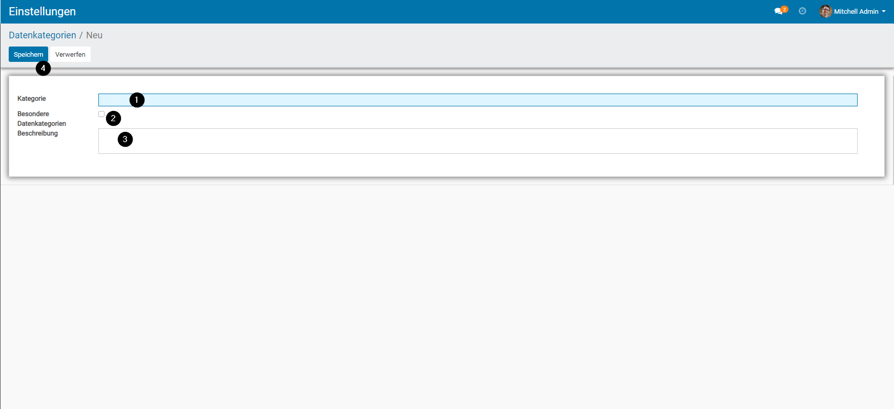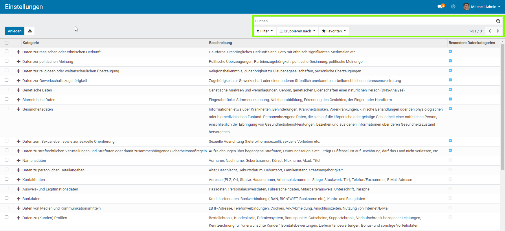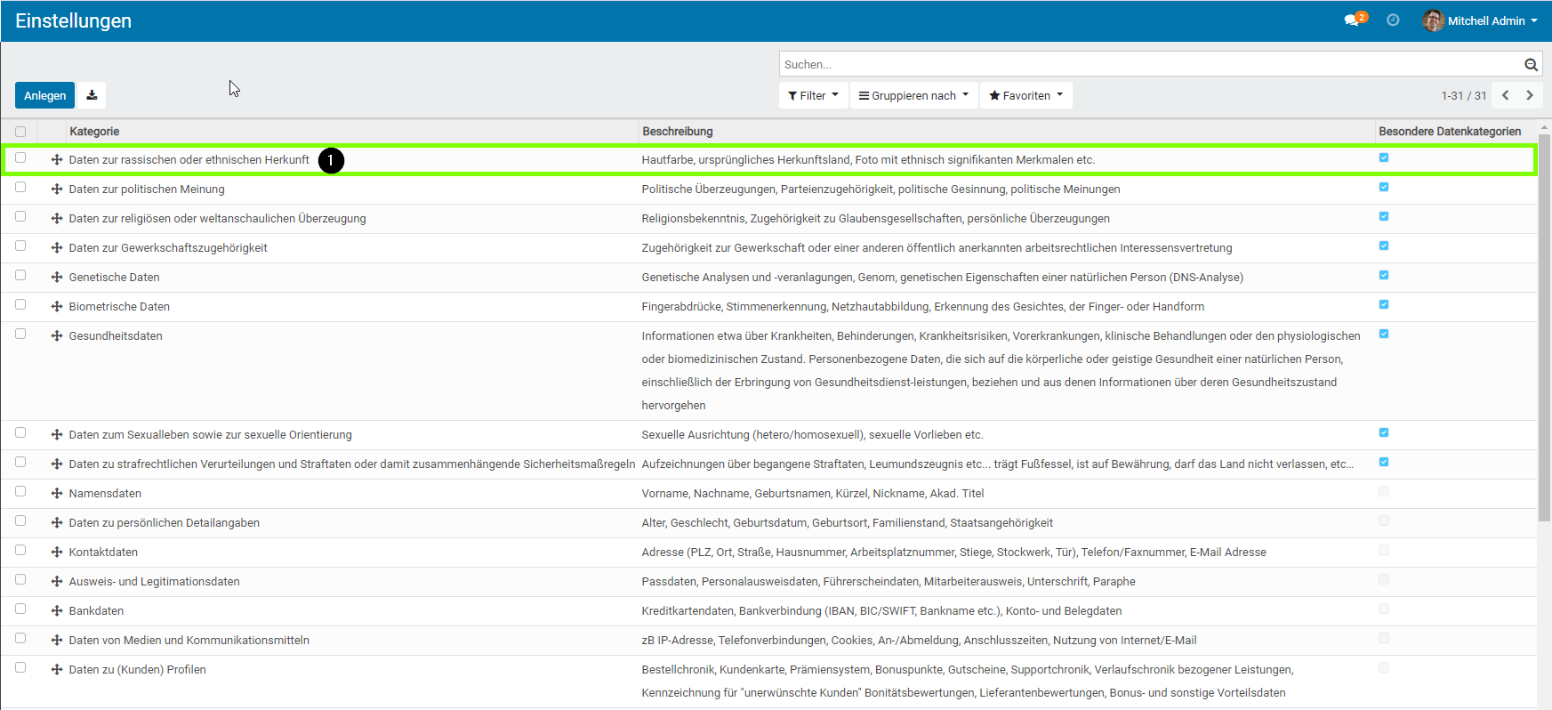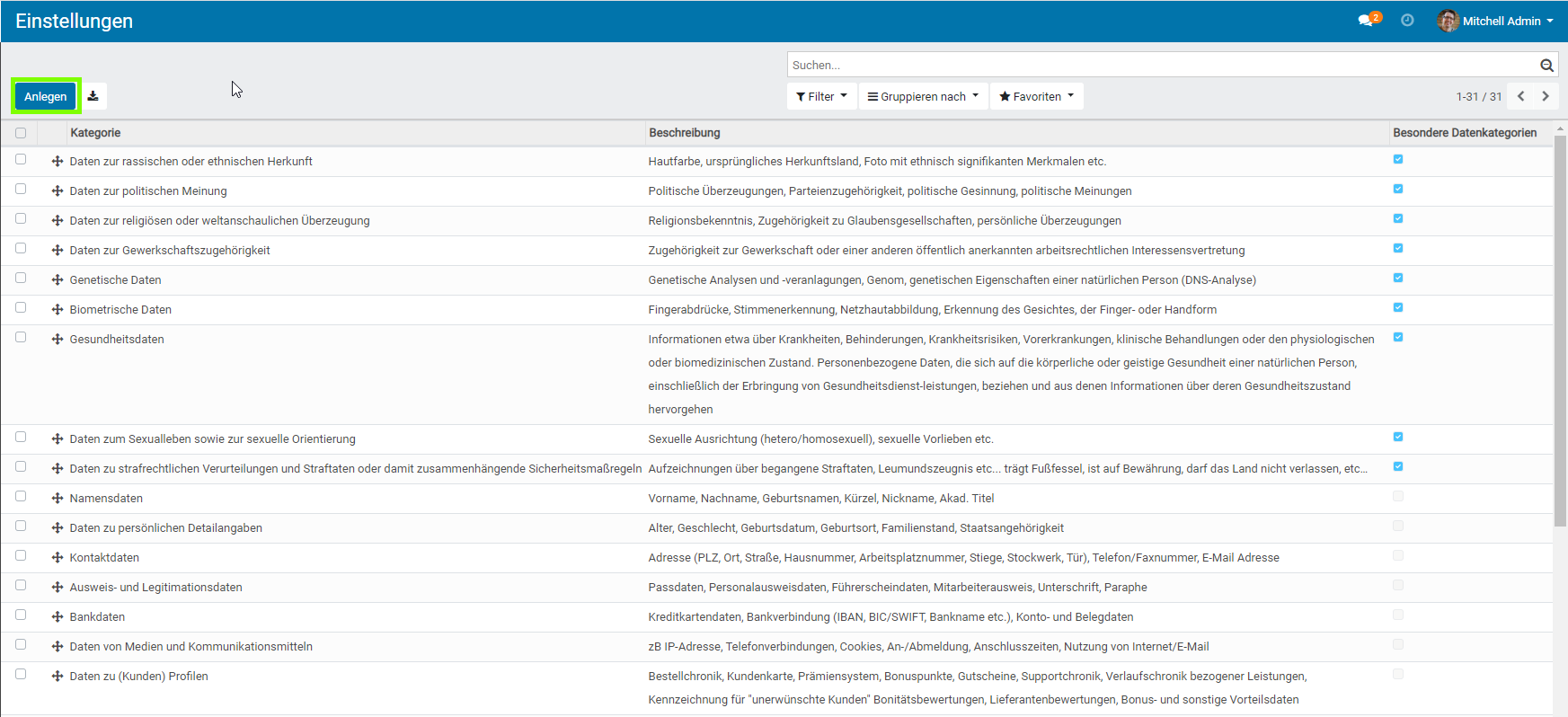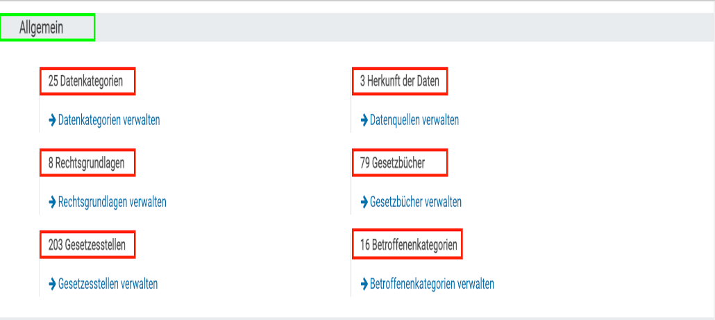 In der Gruppe „Allgemein“ , finden Sie die Einstellungen um „Datenkategorien“ , „Rechtsgrundlagen“ , „Gesetzesstellen“ , „Herkunft der Daten“ , „Gesetzesbücher„, „Deadlines“ und „Betroffenenkategorien“ zu verwalten.
