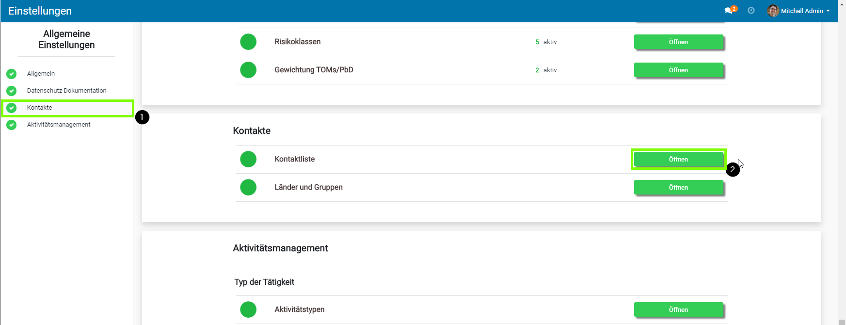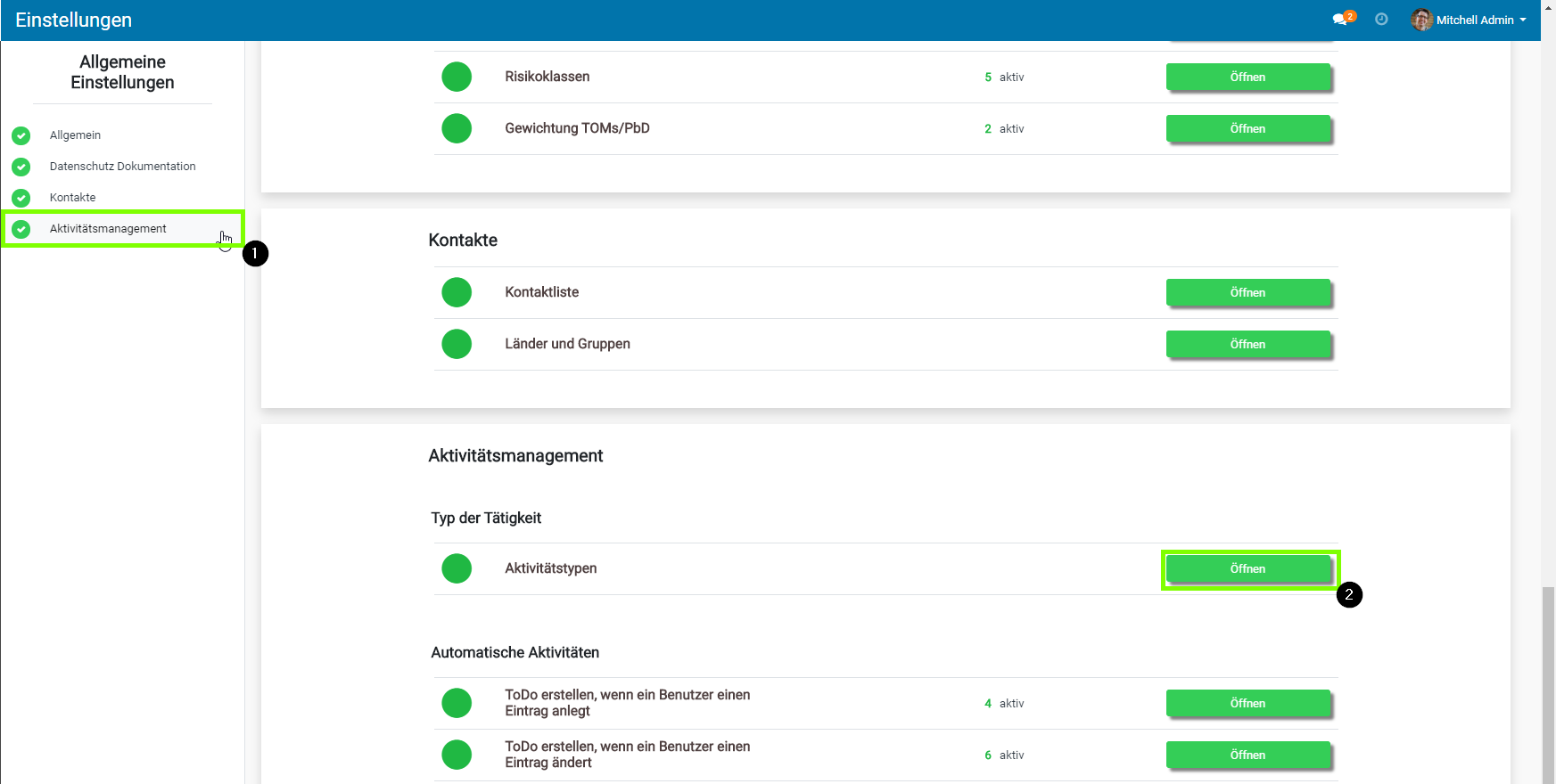 - Wählen Sie den Punkt „Aktivitätsmanagement“ aus und öffnen Sie die Aktivitätstypen.