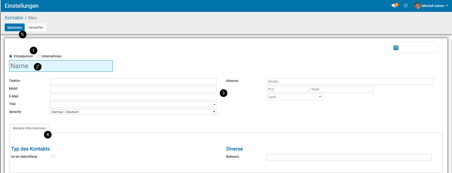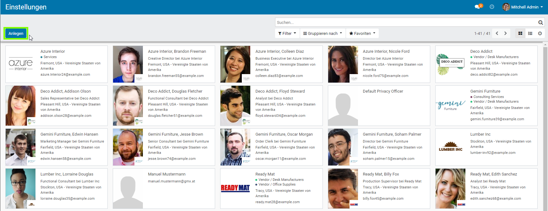 - Hier haben Sie die Möglichkeit Kontakte im System anzulegen, indem Sie auf die Schaltfläche „Anlegen“ klicken.