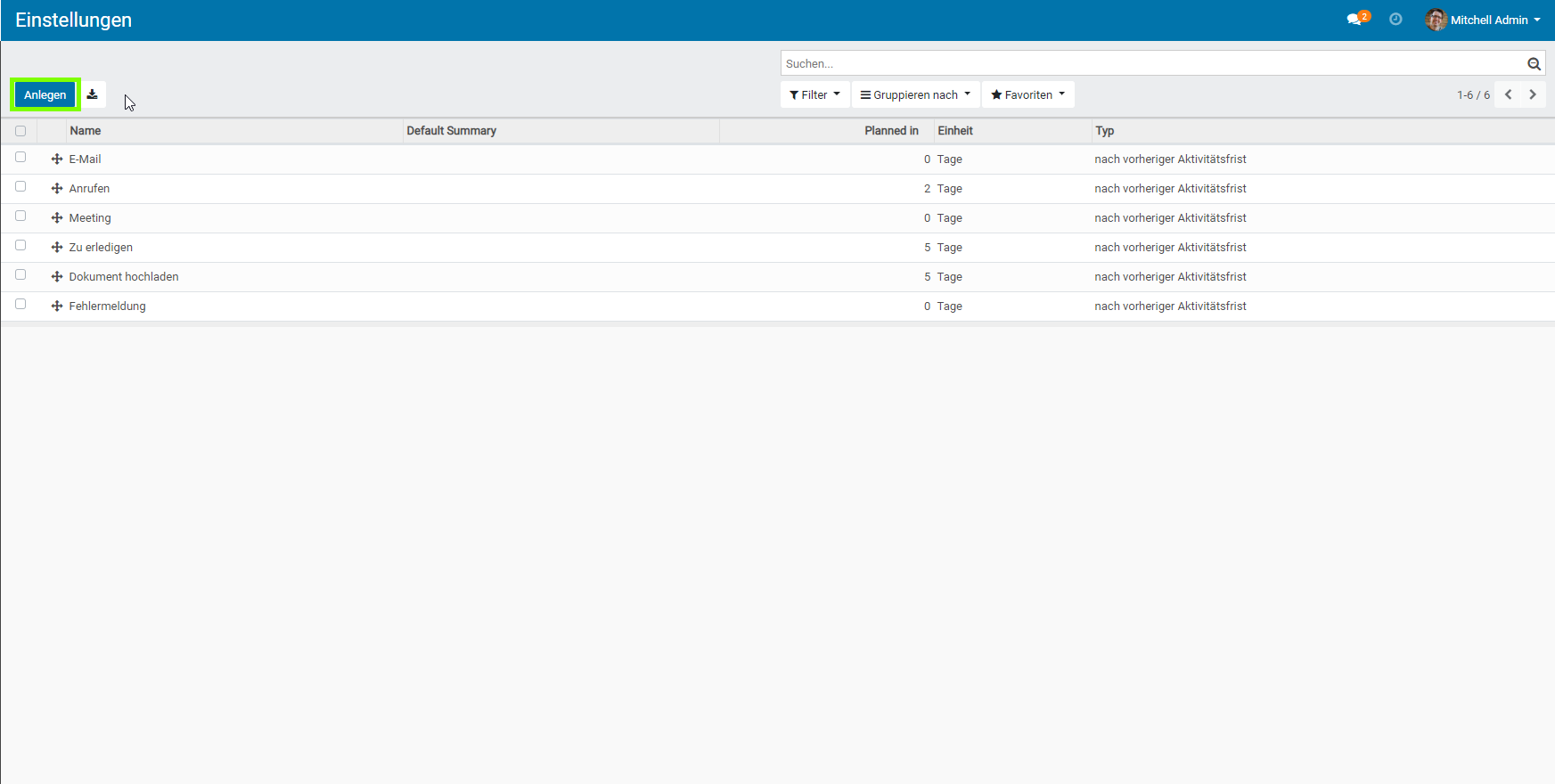 - Klicken Sie auf „Anlegen“ , um einen neuen Aktivitätstyp zu erstellen.