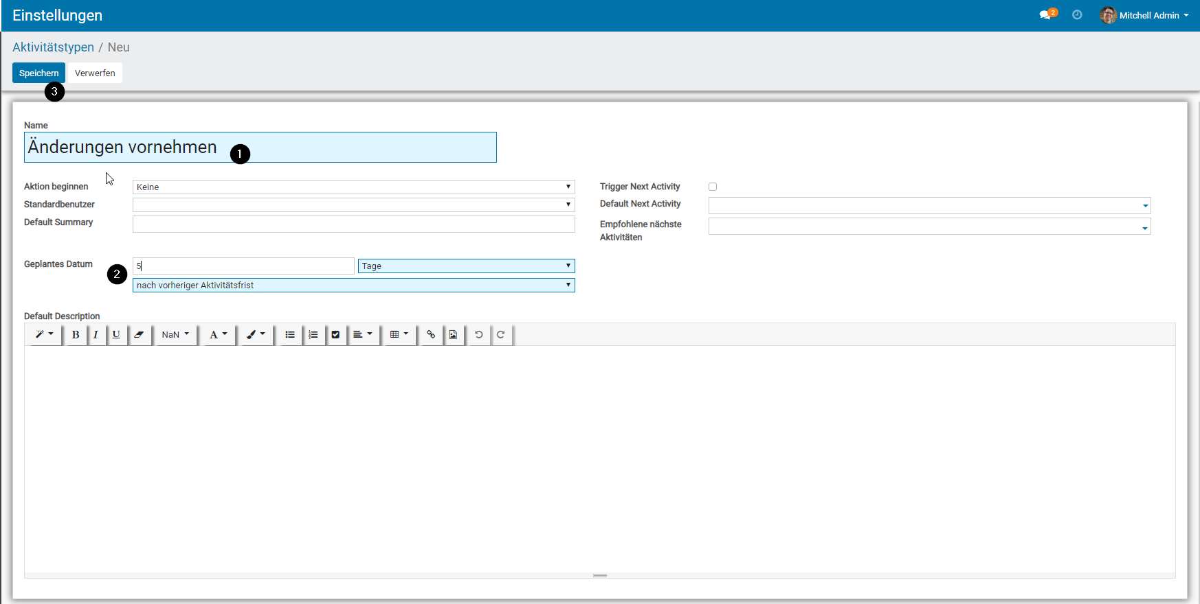 - Benennen Sie den neuen Aktivitätstyp. Optional kann hier festgelegt werden, welche Person für diesen Typ der Aktivität verantwortlich ist und welche Aktivität nach Erledigung der aktuellen Aktivität als nächstes vorgeschlagen wird. Legen Sie außerdem eine Frist fest, innerhalb wie viel Tagen die Aktivität erledigt werden soll.