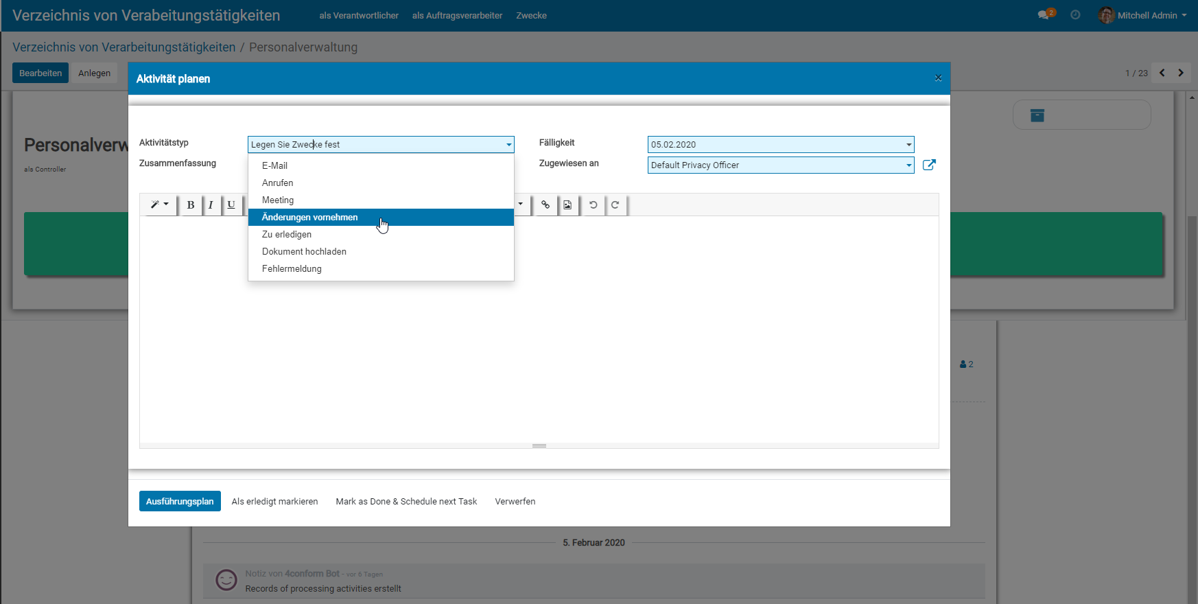 - Bei der Aktivitätsplanung kann man nun sehen, dass der neue Aktivitätstyp hinzugefügt wurde.