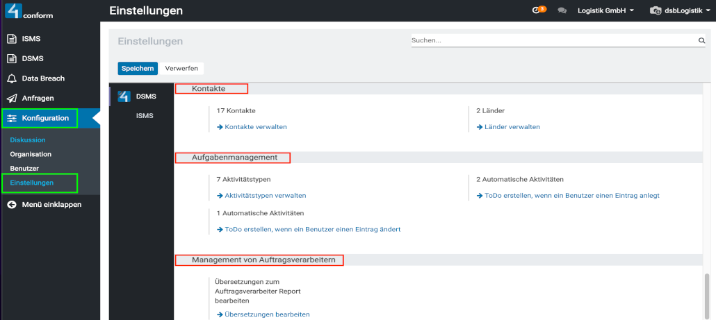 Unter dem Menüpunkt „Konfiguration“ –> „Einstellungen“ , befinden sich die wichtigsten Einstellungen des DSMS-Systems. Hier finden Sie folgende Gruppierungen: