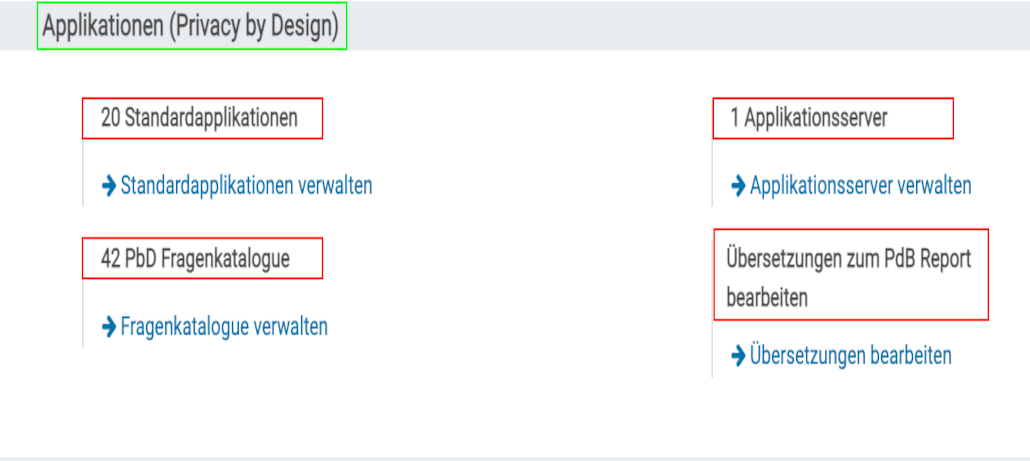 In der Gruppe „Applikationen (Privacy by Design)“ , finden Sie die Einstellungen um „Standardapplikationen“ , „den PbD Fragenkatalog“ , „die Applikationsserver“ und „die Übersetzungen zum PbD Report“ , zu verwalten und zu bearbeiten.