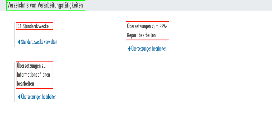 In der Gruppe „Verzeichnis der Verarbeitungstätigkeiten“ , finden Sie die Einstellungen um „Standardzwecke“ , „Übersetzungen zu den Informationspflichten“ und „Übersetzungen zu den RPA Reports“ zu verwalten und zu bearbeiten.