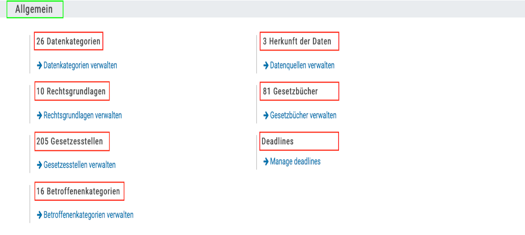 In der Gruppe „Allgemein“ , finden Sie die Einstellungen um „Datenkategorien“ , „Rechtsgrundlagen“ , „Gesetzesstellen“ , „Herkunft der Daten“ , „Gesetzesbücher„, „Deadlines“ und „Betroffenenkategorien“ zu verwalten.