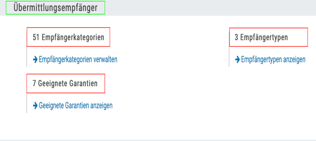 In der Gruppe „Übermittlungsempfänger“ , finden Sie die Einstellungen um „Empfängerkategorien“ , „Geeignete Garantien“ und „Empfängertypen“ zu verwalten und zu bearbeiten.