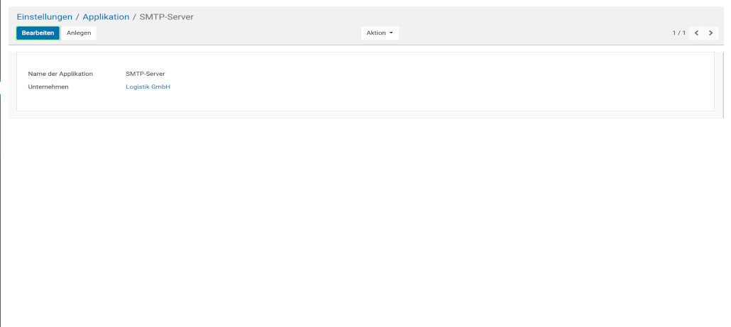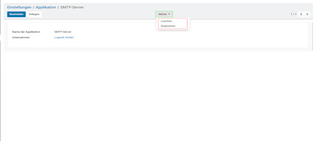 - In dieser Ansicht, erhalten Sie eine kurze Zusammenfassung des ausgewählten Applikationsservers. Zu sehen sind hier, der „Name der Applikation“ und in welchem „Unternehmen“ dieser zu finden ist. Durch betätigen der Schaltfläche „Aktion“ , können Sie diese Auswahl, auch „Löschen“ oder „Duplizieren„.
