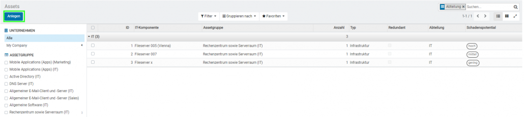 Nun werden Ihnen die bereits erfassten Assets aufgelistet. Auf der linken Seite können diese nach Unternehmen, Kritikalität und Asset Gruppe gefiltert werden.