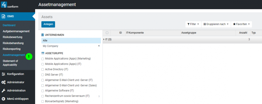 Um zum Assetmanagement zu gelangen wählen Sie den Unterpunkt Assetmanagement im ISMS aus.