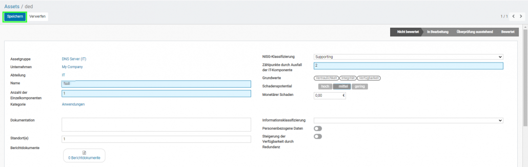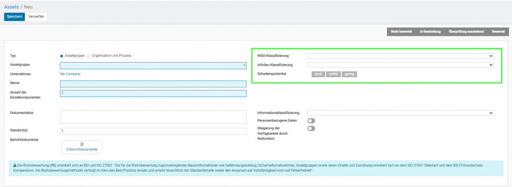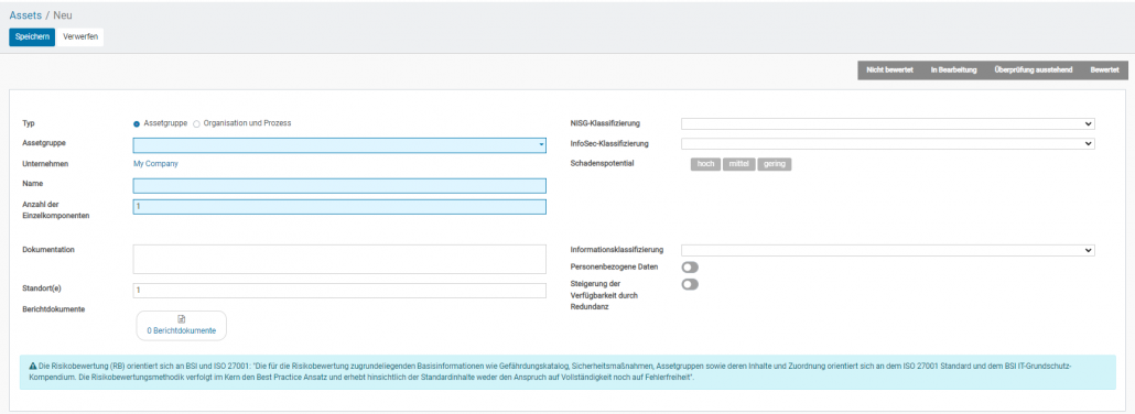 Um ein neues Asset zu erfassen, einer Assetgruppe zuzuordnen und den potentiellen Schaden zu ermitteln, folgen Sie bitte den nachfolgenden Anweisungen.