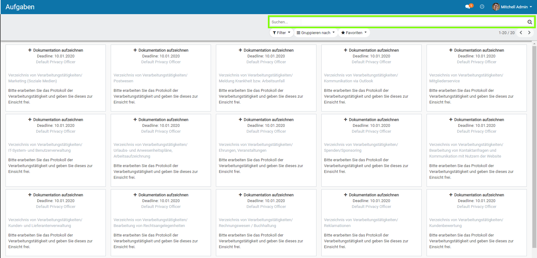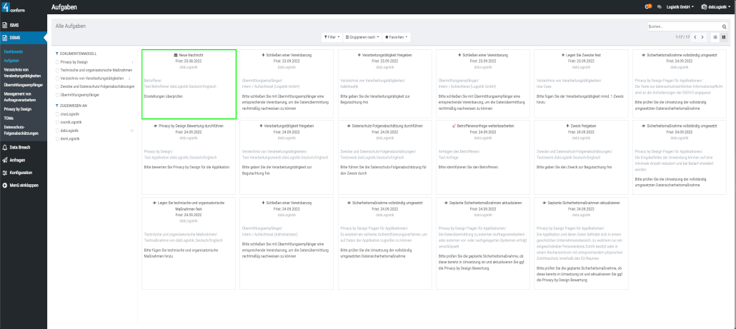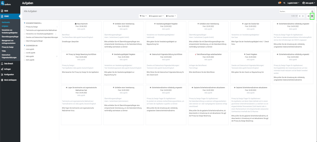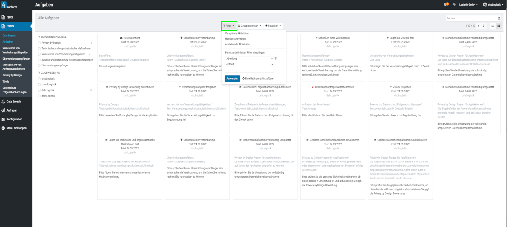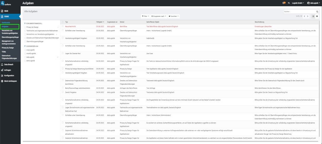 Die Aufgaben dienen zur Übersicht, aller Aufgaben, welche im System vorhanden sind. Je nach Rolle (Datenschutzbeauftragter, Datenschutzmanager, Koordinator), werden die Aufgaben entweder, der zugewiesenen Rolle angezeigt (beim Koordinator) oder der zugewiesenen Abteilung (Datenschutzmanager und Datenschutzbeauftragter).