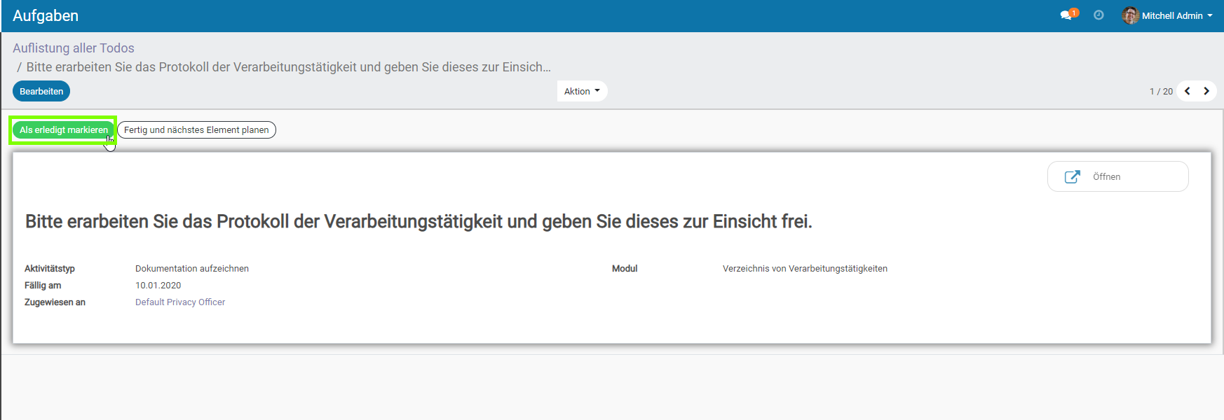 - Wurde die Aufgabe erledigt, können sie durch betätigen der Schaltfläche „Als erledigt markieren„, diese als abgeschlossen geltend machen.