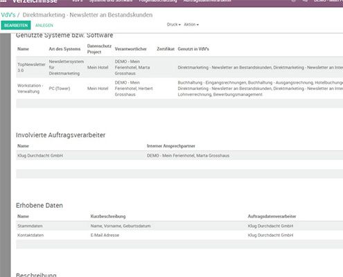 - Systeme: Weisen Sie Ihren Auftragsverarbeiter genutzte Systeme zu.z.B.: Marketing Agentur hat Zugang zum Newslettersystem