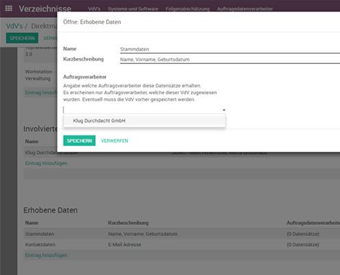 - Angabe der Auftragsverarbeiter und Empfänger: Geben Sie an welche Auftragsverarbeiter in den erstellten Verarbeitungstätigkeiten involviert sind.z.B.: Buchhalter in Fakturierung, Marketing Agentur in Newsletterversand