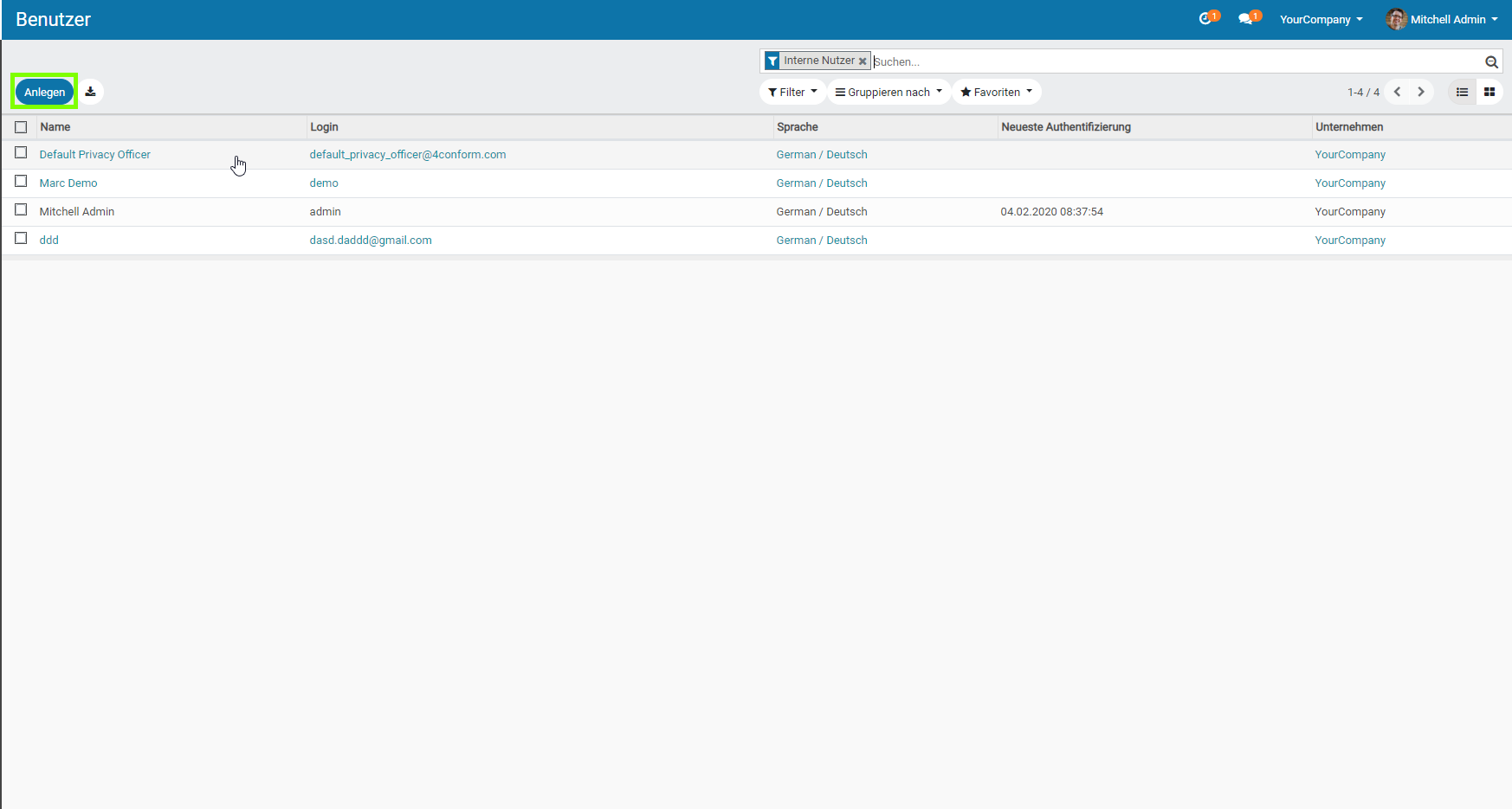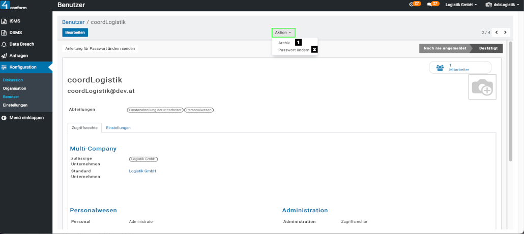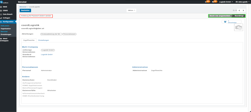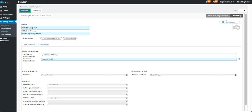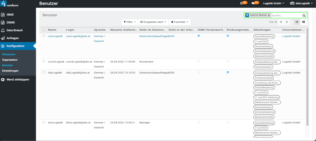 Dieser Menüpunkt ist nur für den Datenschutzbeauftragten ersichtlich und dient zur Bearbeitung vorhandener Benutzer. Unter dem Menüpunkt „Konfiguration“ –> „Benutzer“ , kann man eine Liste aller Benutzer, der aktuellen Firma sehen und deren zugeteilten Abteilungen sowie Rollen.
