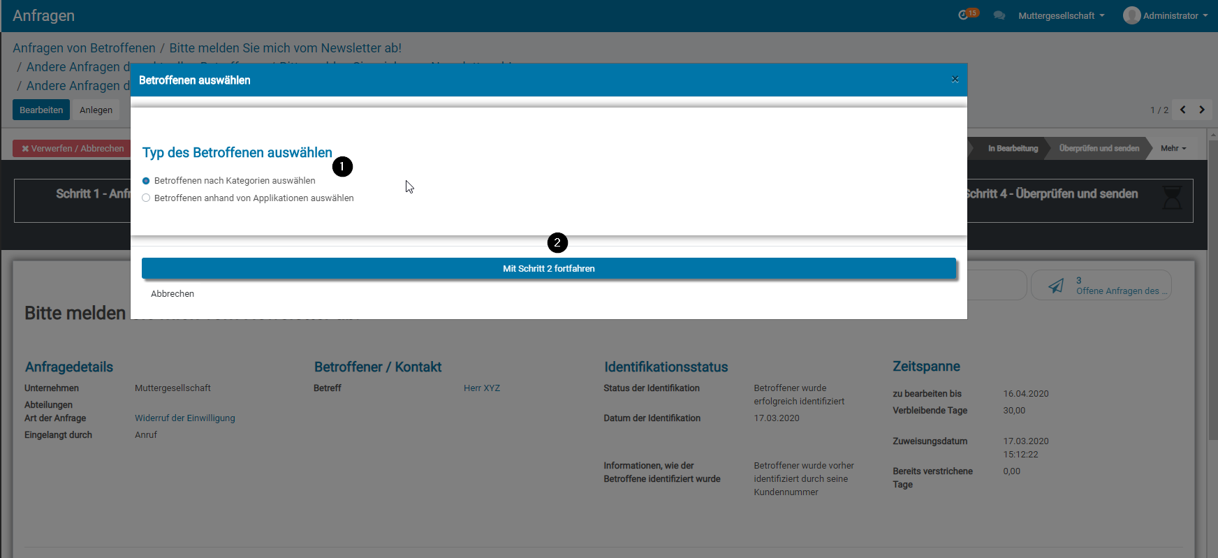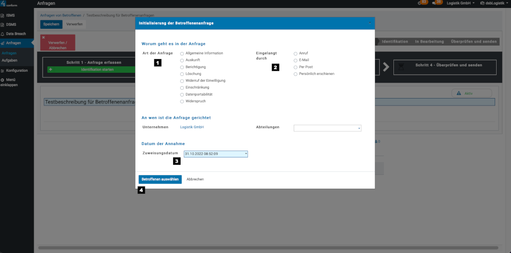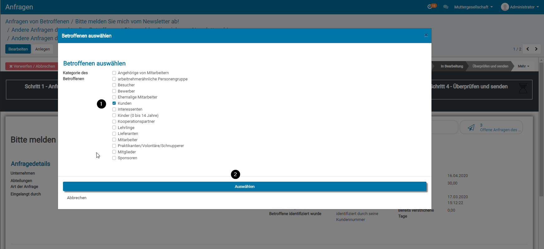 - In den nun erschienenen Pop-up Fenster, wählen Sie die Art der Anfrage, das Medium wie die Anfrage eingelangt ist und das Datum der Annahme. Nachdem die Felder korrekt ausgefüllt worden sind, klicken Sie auf den Button „Betroffenen auswählen„.