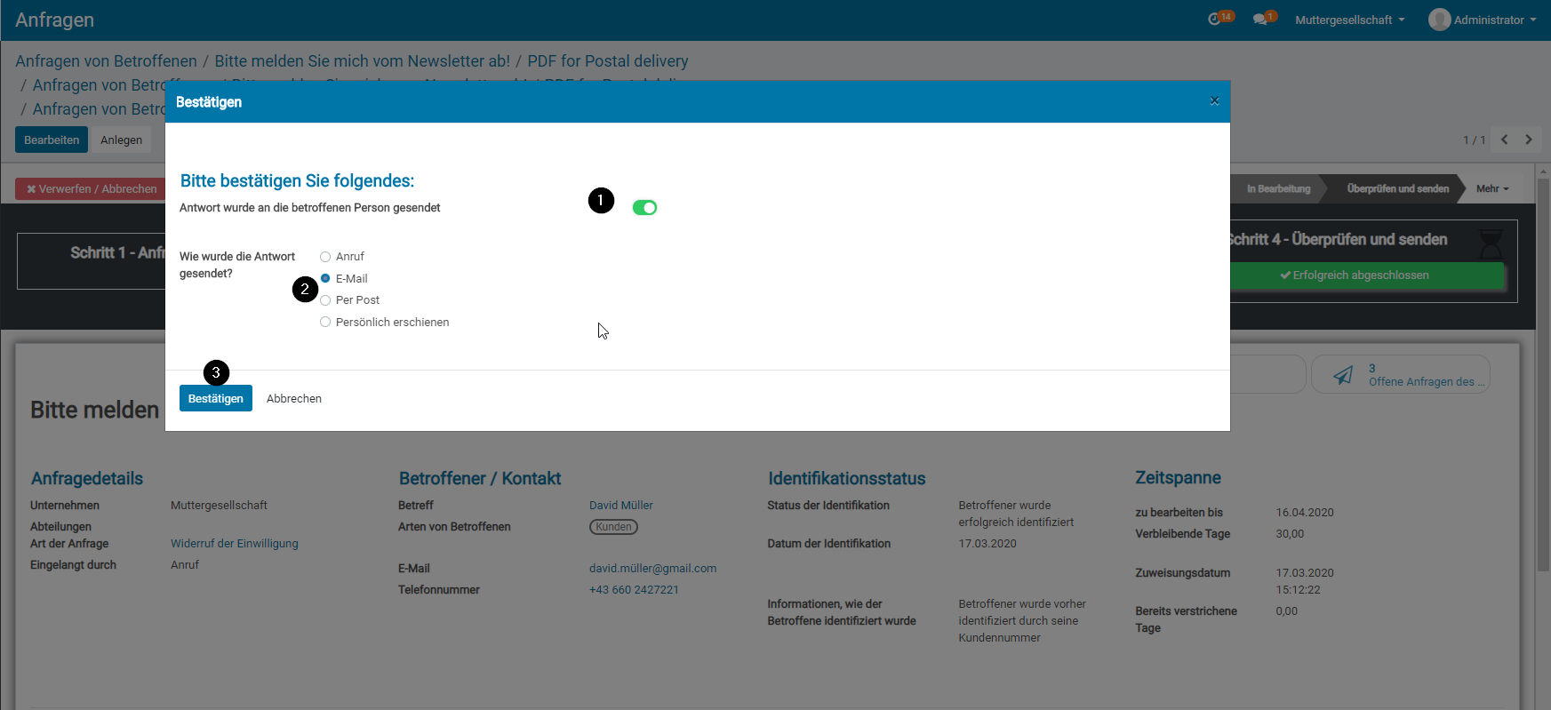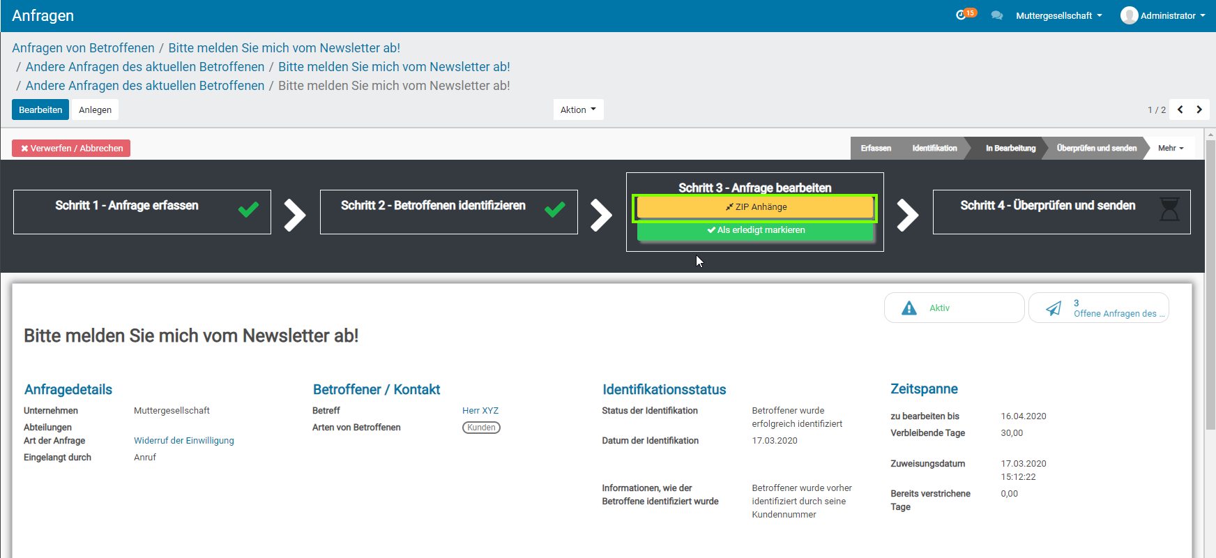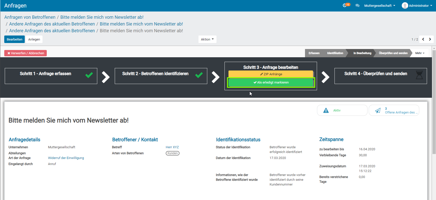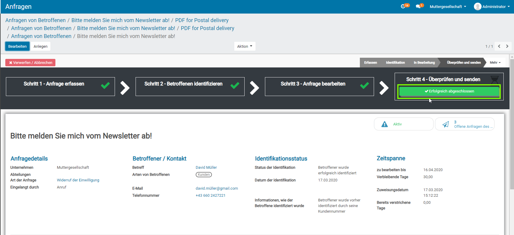 - Wurden alle Punkte abgearbeitet, überprüft und ein Antwortschreiben an den Betroffenen versandt, so wählen Sie die Schaltfläche „Erfolgreich abgeschlossen“ aus.