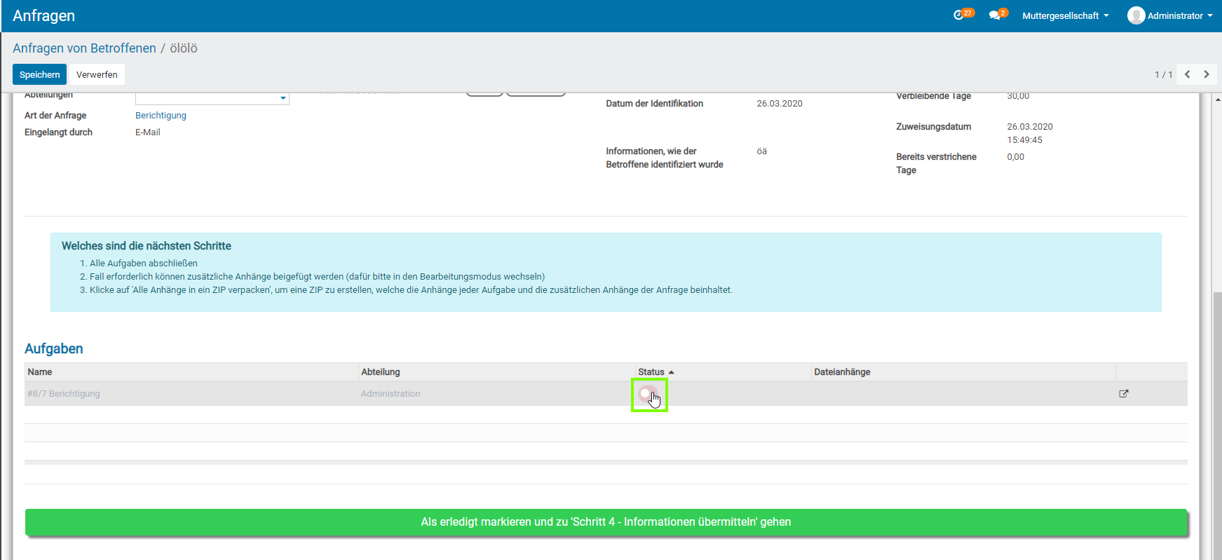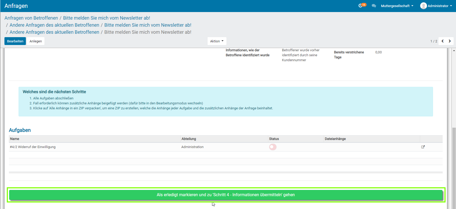 - Die dritte Möglichkeit zum nächsten Schritt zu gelangen, ist durch den Button „Als erledigt markieren und zu Schritt 4 – Informationen übermitteln gehen“ am unteren Ende der Seite.