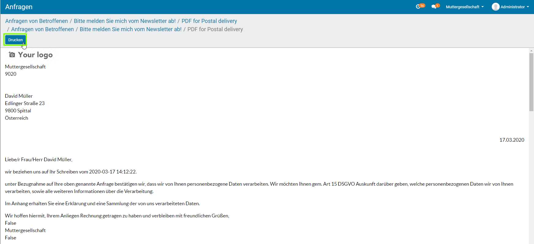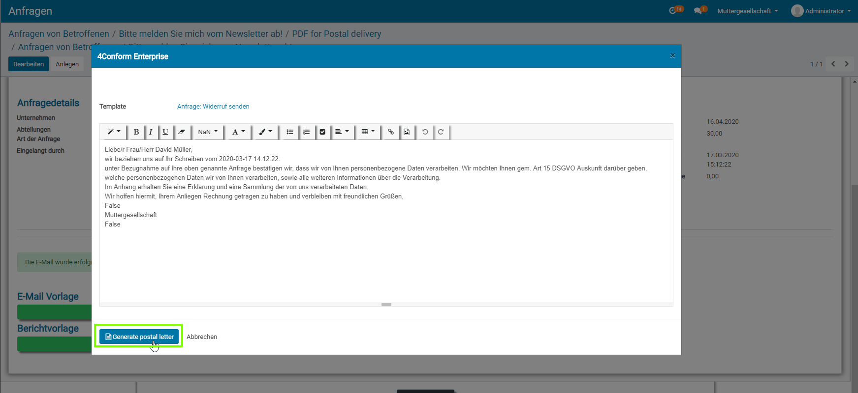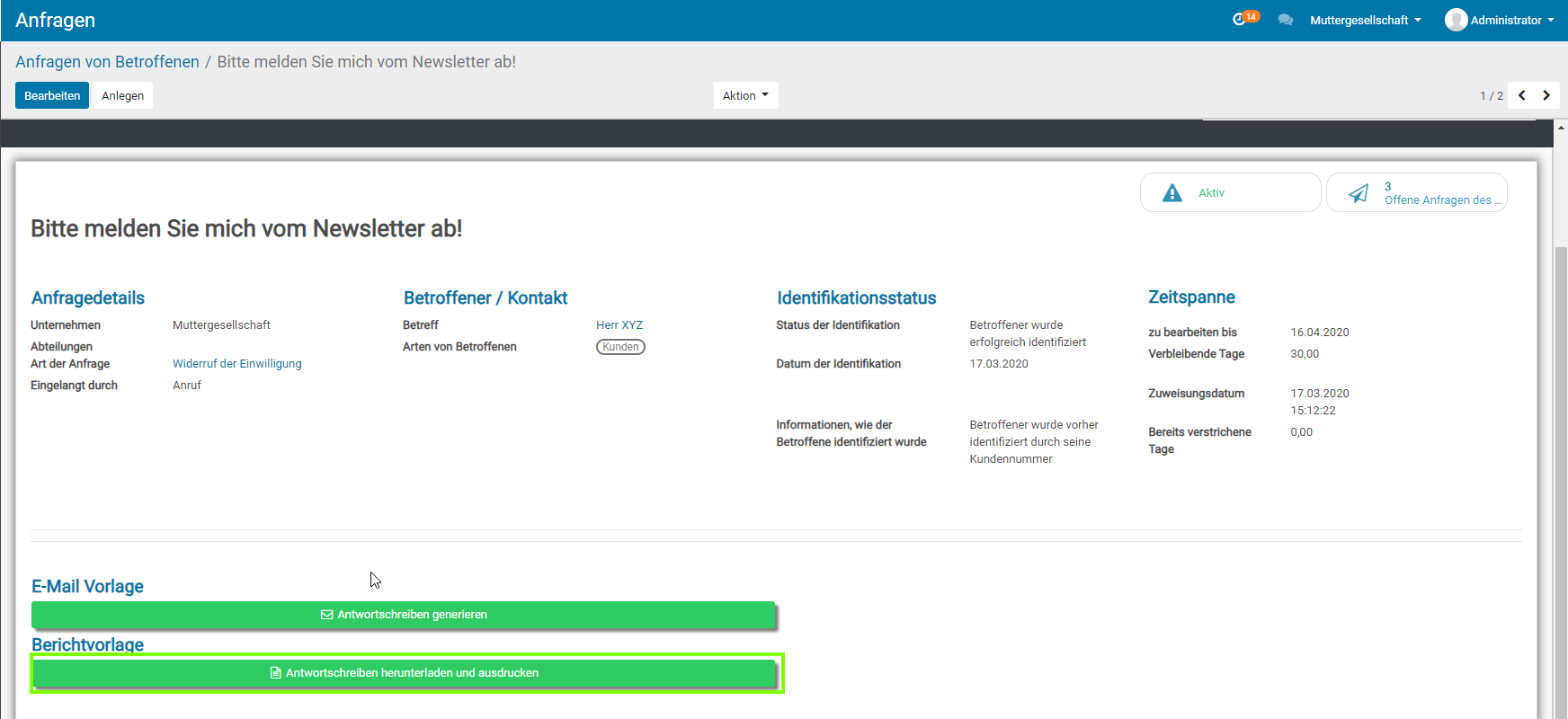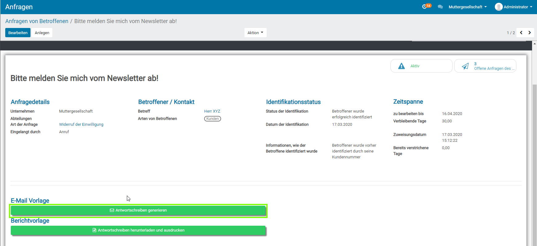 - Optional haben Sie hier die Möglichkeit ein Antwortschreiben an den Betroffenen zu generieren. Klicken Sie hierfür auf den markierten Button.
