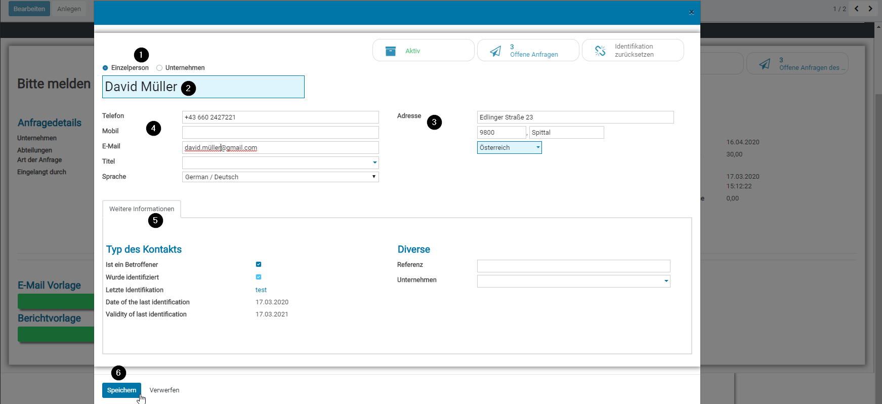 - In dem erschienen Pop-Up Fenster geben Sie die Kontaktdaten und den Typ des Betroffenen ein. Nachdem Sie die Felder befüllt haben, klicken Sie auf „Speichern“ .