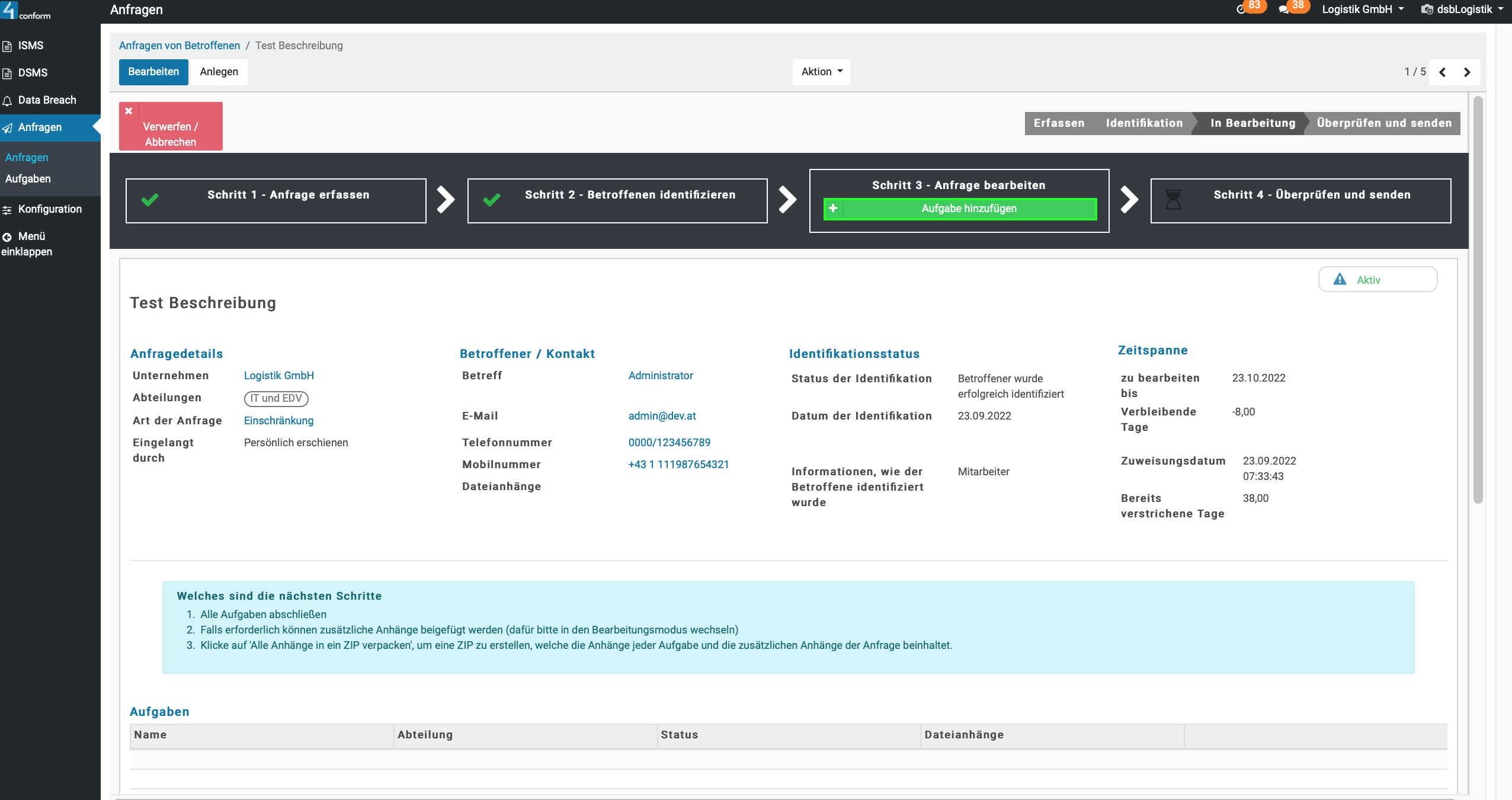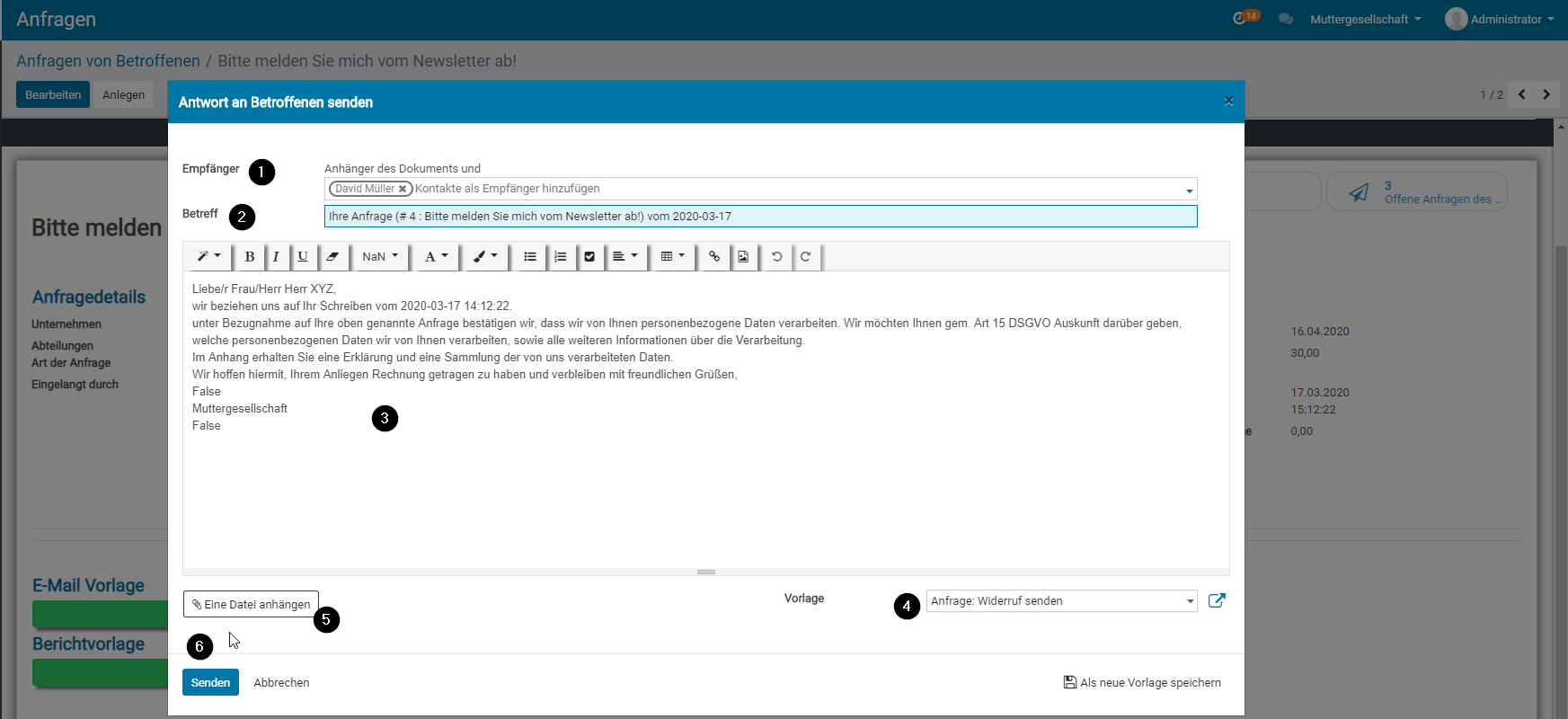 Hier können Sie Betroffenenanfragen erfassen, bearbeiten und mittels generierten Antwortschreibens überprüft an den Betroffenen senden.