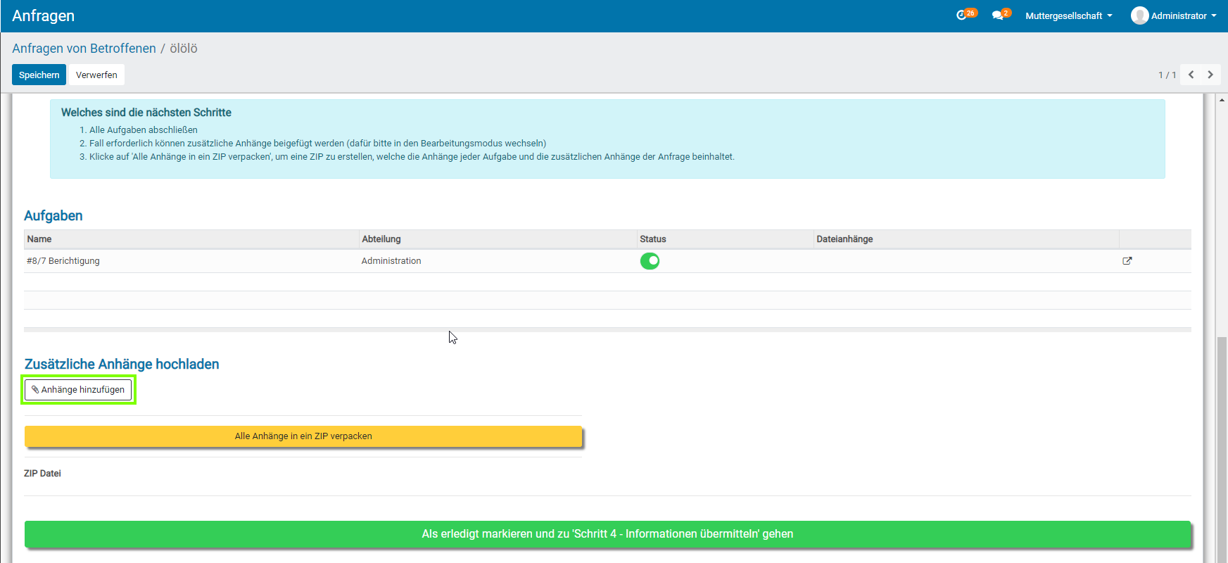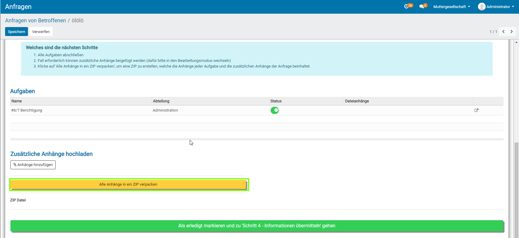 - Sie haben auch die Möglichkeit, anhand des hier markierten Buttons eine ZIP zu erstellen, welche die Anhänge jeder Aufgabe und dieser Anfrage beinhaltet.