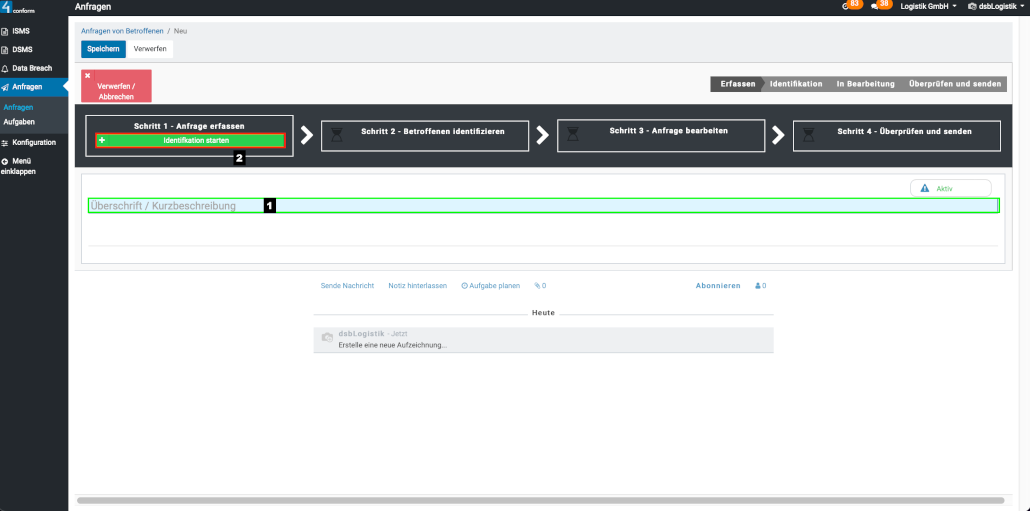 - Geben Sie in das Textfeld eine Überschrift/Kurzbeschreibung zur Betroffenenanfrage ein und klicken sie anschließend auf den Button „Identifikation starten“ .