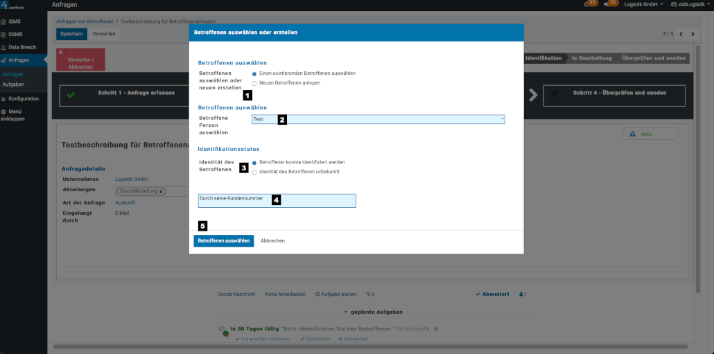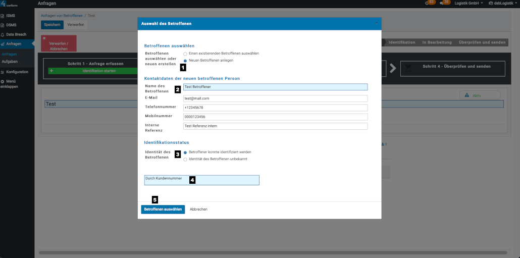 - Um den Betroffenen neu zu erstellen, wählen sie die Option „Neuen Betroffenen anlegen„. Danach geben sie die Kontaktdaten der neuen betroffenen Person ein und setzen den Identifikationsstatus, zusammen mit einer kurzen Erklärung. Anschließend wählen sie die Schaltfläche „Betroffenen auswählen„.