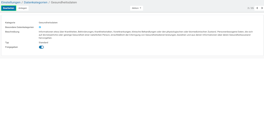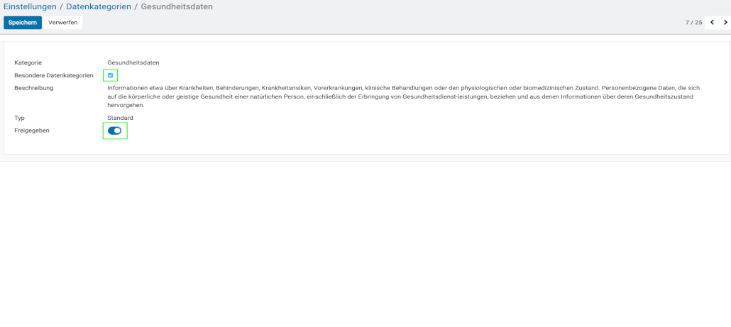 - Im Bearbeitungsmodus, können Sie mit den benötigten Rechten, die Datenkategorie als „Besondere Datenkategorie“ kennzeichnen und auch festlegen, ob diese eine „Freigabe“ hat oder nicht. Nach Abschluss der Einstellungen muss diese nur noch mit der Schaltfläche „Speichern“ , gesichert werden.
