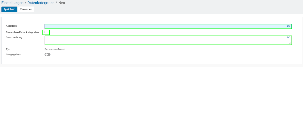 - Nach Auswahl der Schaltfläche „Anlegen“ in der Übersicht, oder durch Auswahl der Schaltfläche „Anlegen„, in der ausgewählten Datenkategorie, gelangen Sie zur Erstellung einer neuen Kategorie.