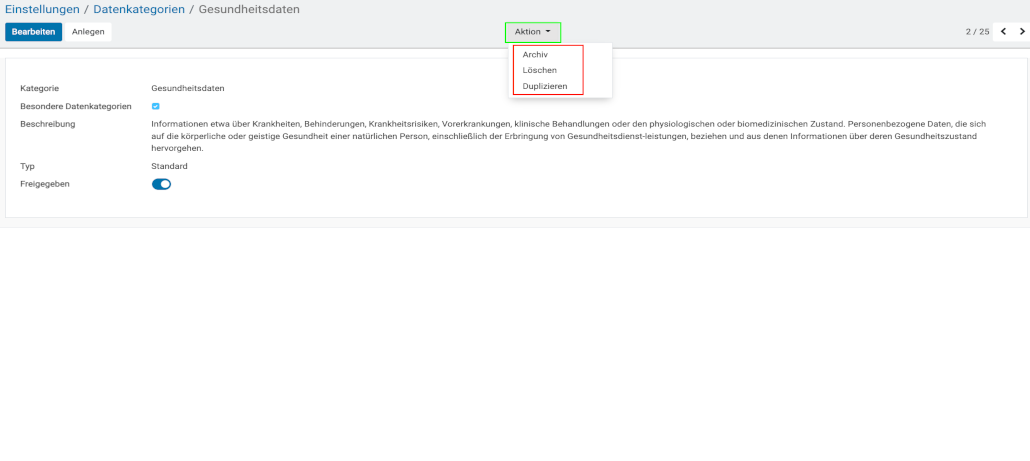 - Hier erhalten Sie eine nochmalige Übersicht der ausgewählten Datenkategorie, inklusive ihrer Beschreibung. Die Schaltfläche „Aktion“ , erlaubt Ihnen, die aktuell ausgewählte Datenkategorie ins „Archiv“ zu verschieben, zu „Löschen“ oder zu „Duplizieren„