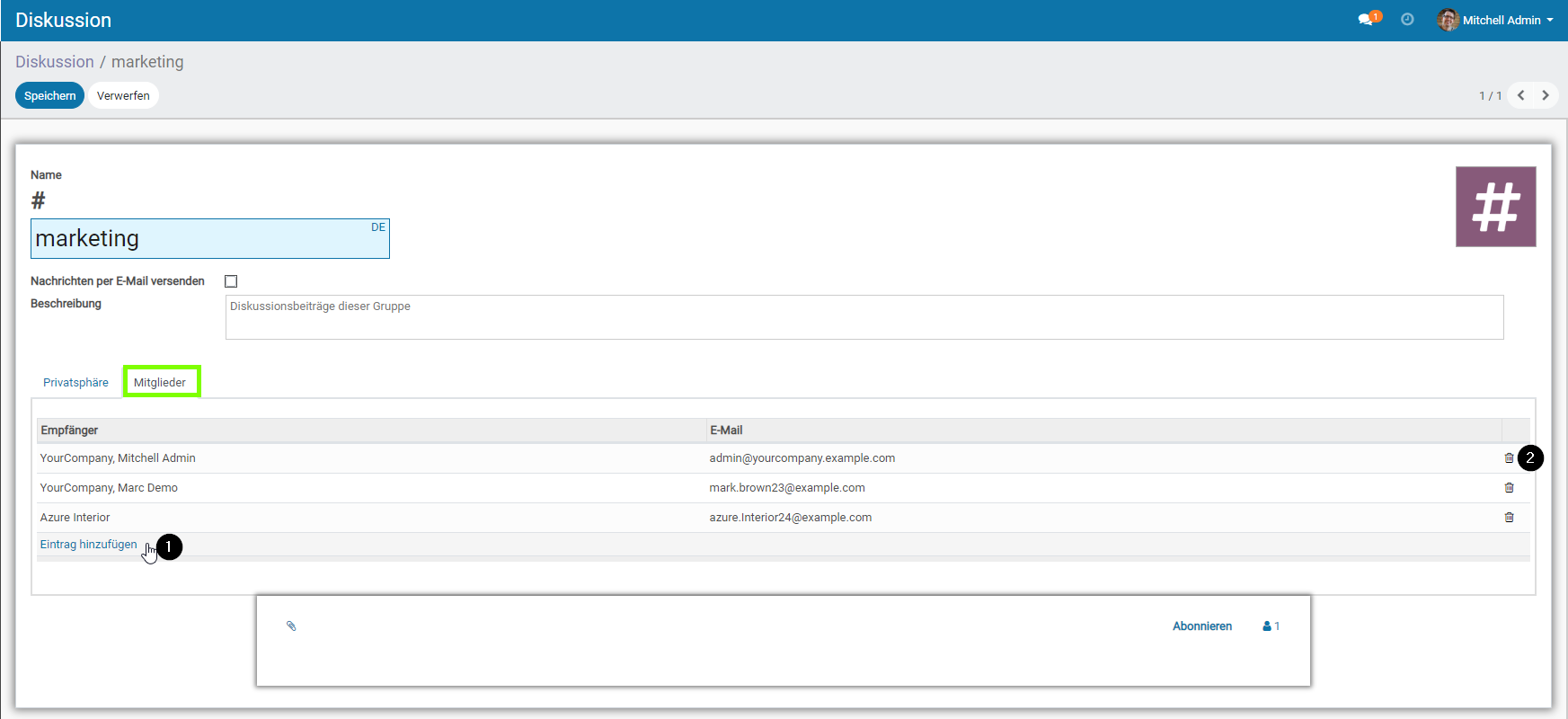 - Unter dem Reiter „Mitglieder“ , erhalten sie eine Übersicht über alle Benutzer, welche ihren Kanal abonniert haben. Außerdem können sie dort auch Benutzer bzw. Benutzergruppen löschen (Siehe Markierung „1„) oder hinzufügen (Siehe Markierung „2„).