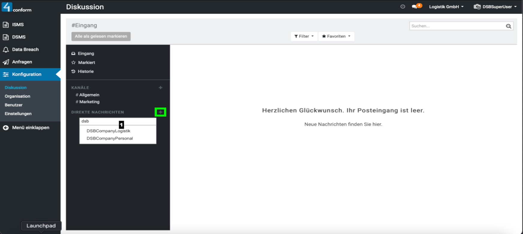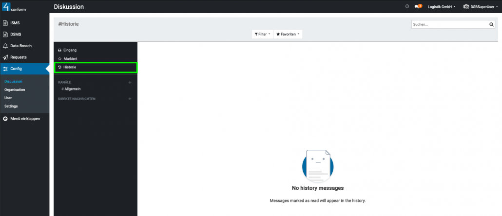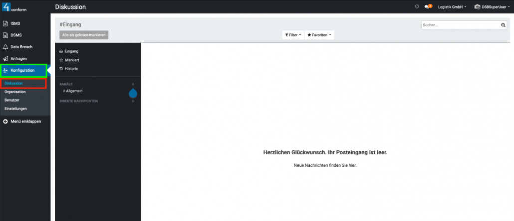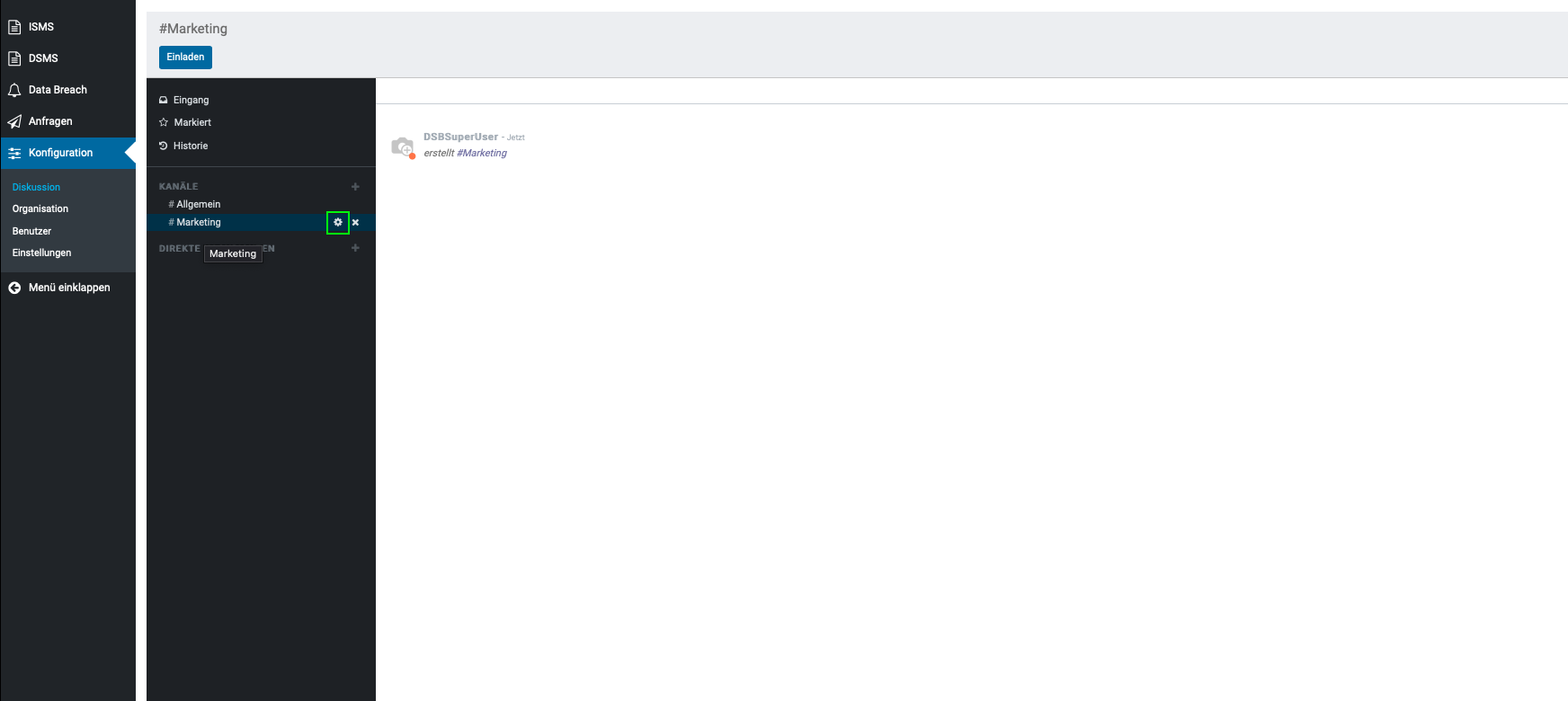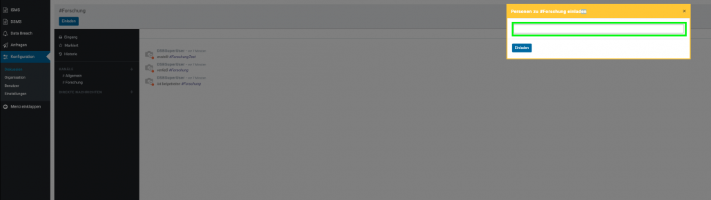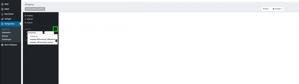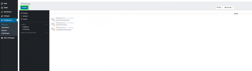 Aufzufinden ist diese unter dem Menüpunkt “ Konfiguration“ und dient zur Kommunikation zwischen den einzelnen Benutzern. Hier können sie Direktnachrichten an Benutzer senden, oder einen Kanal erstellen, welcher zum Informationsaustausch mehrerer Benutzer dient und somit eine leichtere Organisation der Informationen innerhalb einer Gruppe ermöglicht. Beispiele für Kanäle: #Marketing, #Vertrieb, #Forschung usw. Da der Menüpunkt „Konfiguration„, nur dem Datenschutzbeauftragten vorbehalten ist, kann auch nur dieser, die Verwaltung der Kanäle vornehmen.