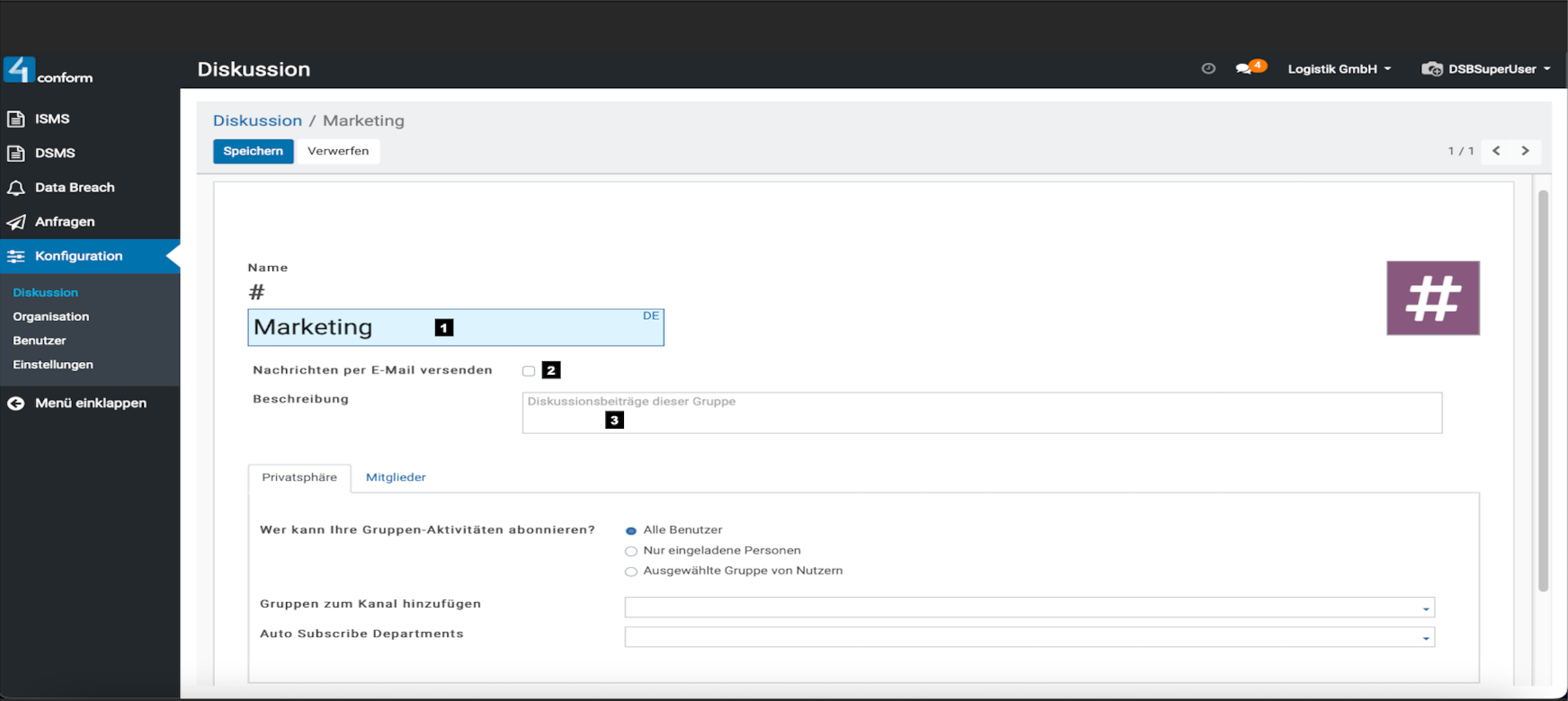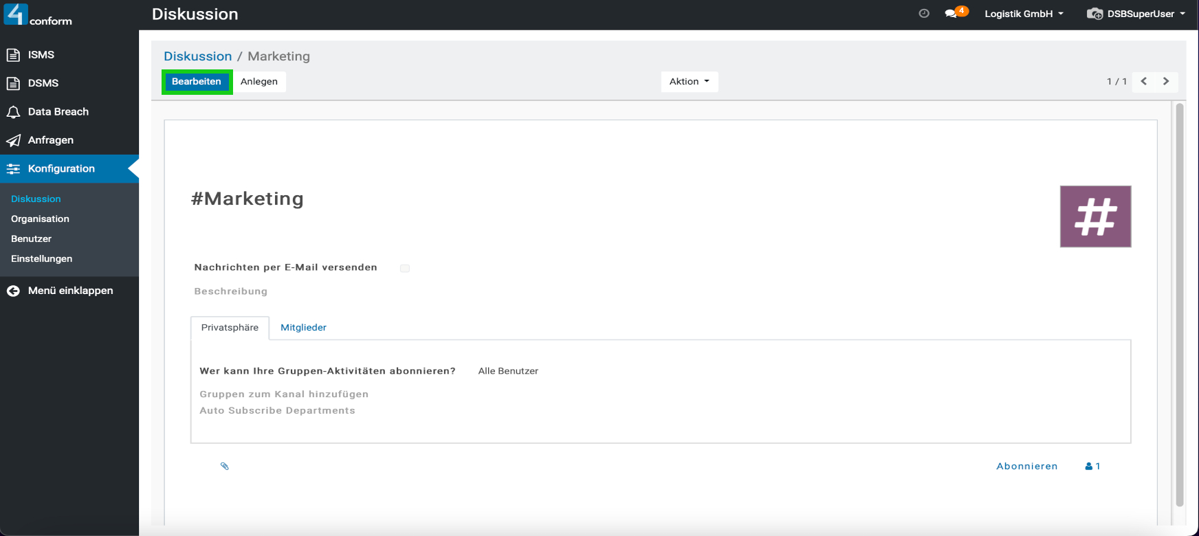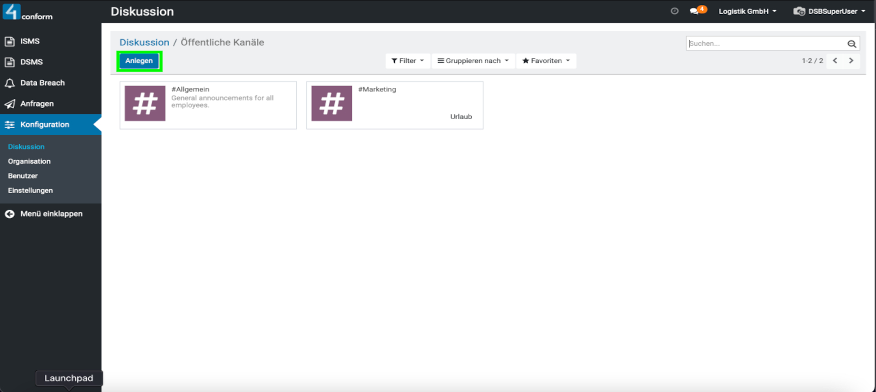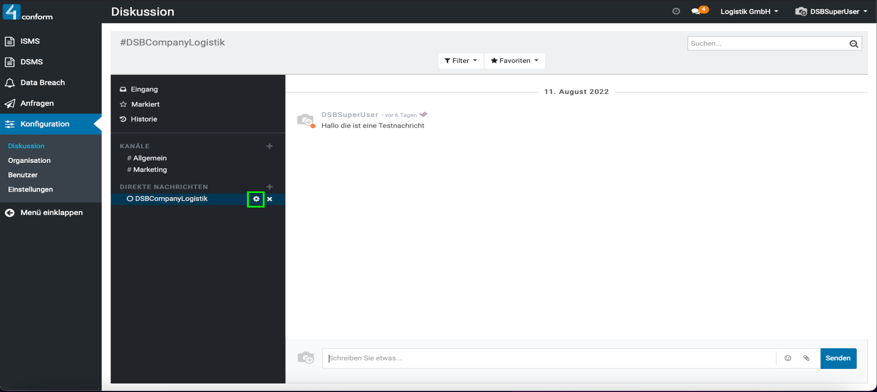 Aufzufinden ist diese unter dem Menüpunkt “ Konfiguration“ und dient zur Kommunikation zwischen den einzelnen Benutzern. Hier können sie Direktnachrichten an Benutzer senden, oder einen Kanal erstellen, welcher zum Informationsaustausch mehrerer Benutzer dient und somit eine leichtere Organisation der Informationen innerhalb einer Gruppe ermöglicht. Beispiele für Kanäle: #Marketing, #Vertrieb, #Forschung usw. Da der Menüpunkt „Konfiguration„, nur dem Datenschutzbeauftragten vorbehalten ist, kann auch nur dieser, die Verwaltung der Kanäle vornehmen.