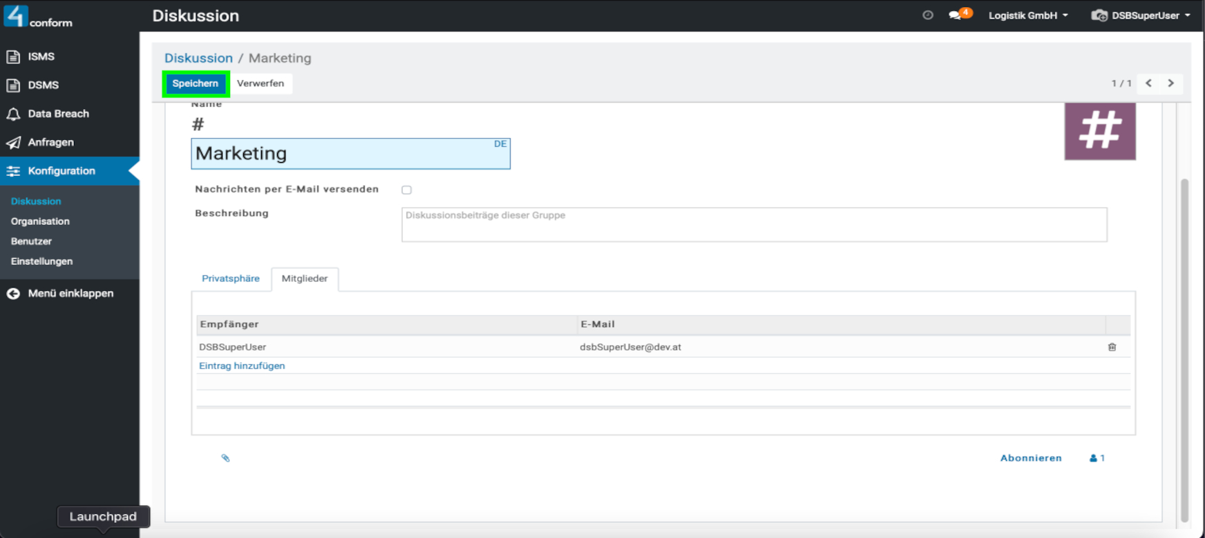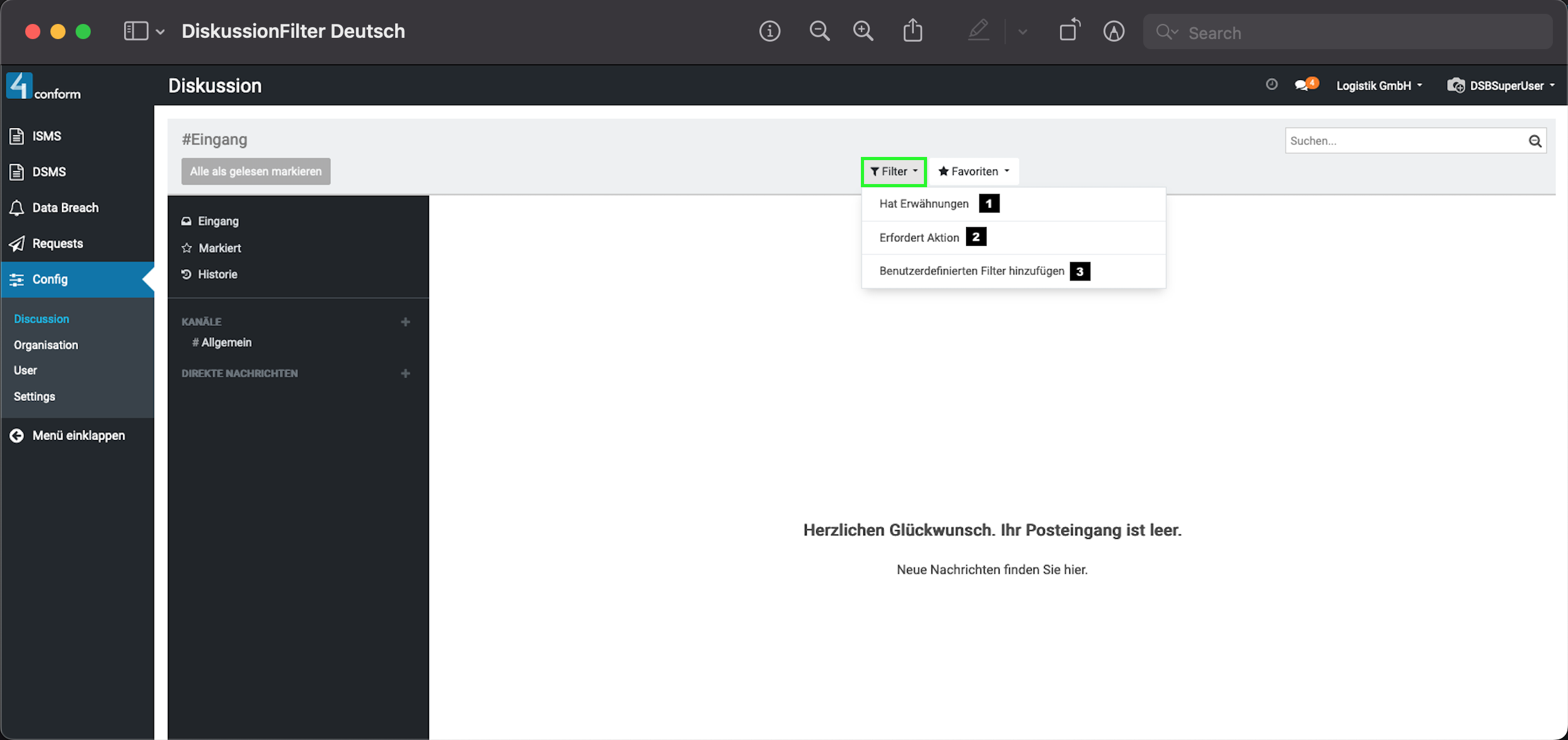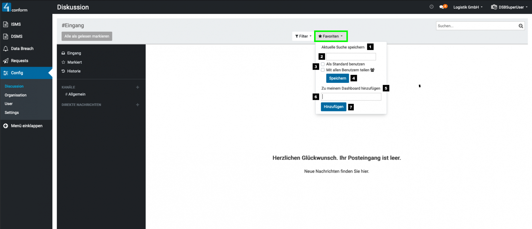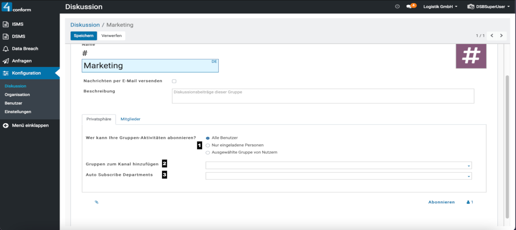 Aufzufinden ist diese unter dem Menüpunkt “ Konfiguration“ und dient zur Kommunikation zwischen den einzelnen Benutzern. Hier können sie Direktnachrichten an Benutzer senden, oder einen Kanal erstellen, welcher zum Informationsaustausch mehrerer Benutzer dient und somit eine leichtere Organisation der Informationen innerhalb einer Gruppe ermöglicht. Beispiele für Kanäle: #Marketing, #Vertrieb, #Forschung usw. Da der Menüpunkt „Konfiguration„, nur dem Datenschutzbeauftragten vorbehalten ist, kann auch nur dieser, die Verwaltung der Kanäle vornehmen.