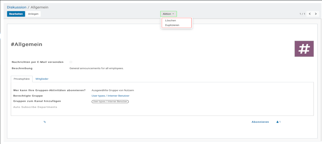 - Mit Hilfe der Schaltfläche „Aktion„, können Sie den derzeitigen Kanal löschen oder duplizieren.