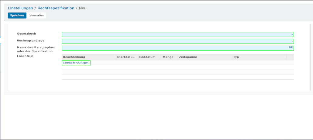 - Nach Auswahl der Schaltfläche „Anlegen“ in der Übersicht, oder durch Auswahl der Schaltfläche „Anlegen„, in der ausgewählten Gesetzesstelle, gelangen Sie zur Erstellung einer neuen Gesetzesstelle.