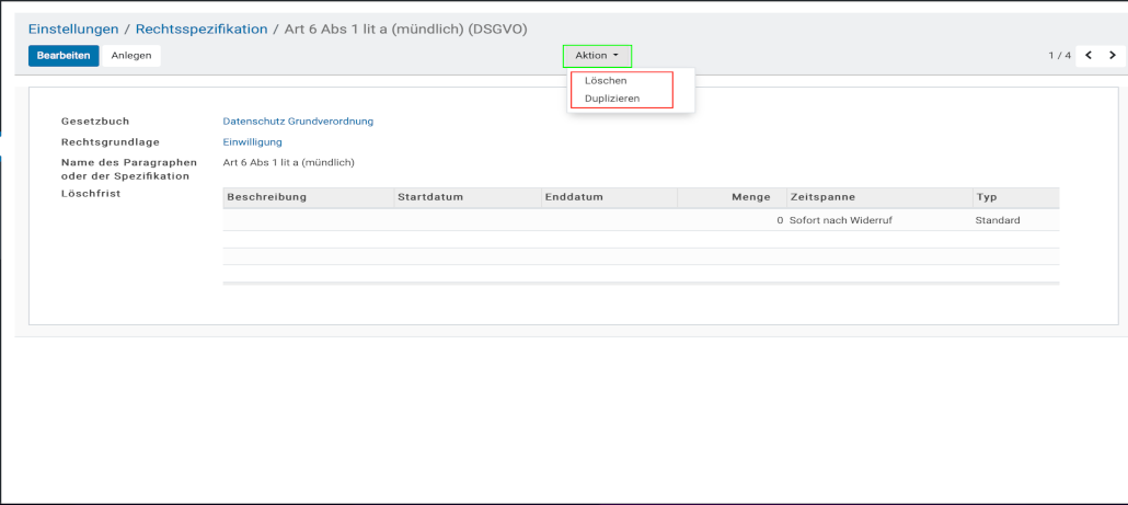 - Hier erhalten Sie eine nochmalige Übersicht der ausgewählten Gesetzesstelle, inklusive ihrer Beschreibung. Die Schaltfläche „Aktion“ , erlaubt Ihnen, die aktuell ausgewählte Gesetzesstelle zu „Löschen“ oder zu „Duplizieren„.