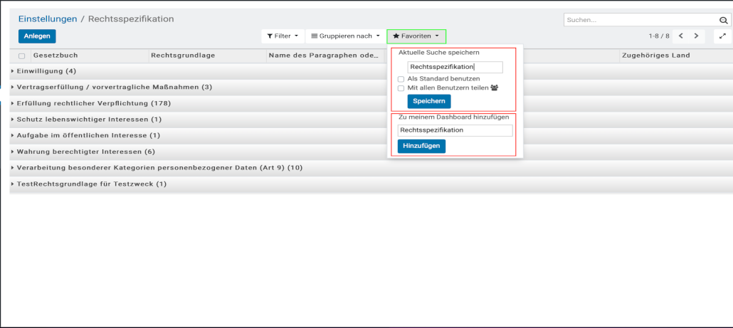 - Durch Auswahl der Schaltfläche „Favoriten„, können Sie, Ihre Suche speichern und entscheiden, ob Sie diese „Als Standard“ verwenden möchten oder „Mit allen Benutzern teilen“ möchten. Außerdem besteht die Möglichkeit, die benutzerdefinierte Suche, auf Ihr eigenes „Dashboard“ zu integrieren.