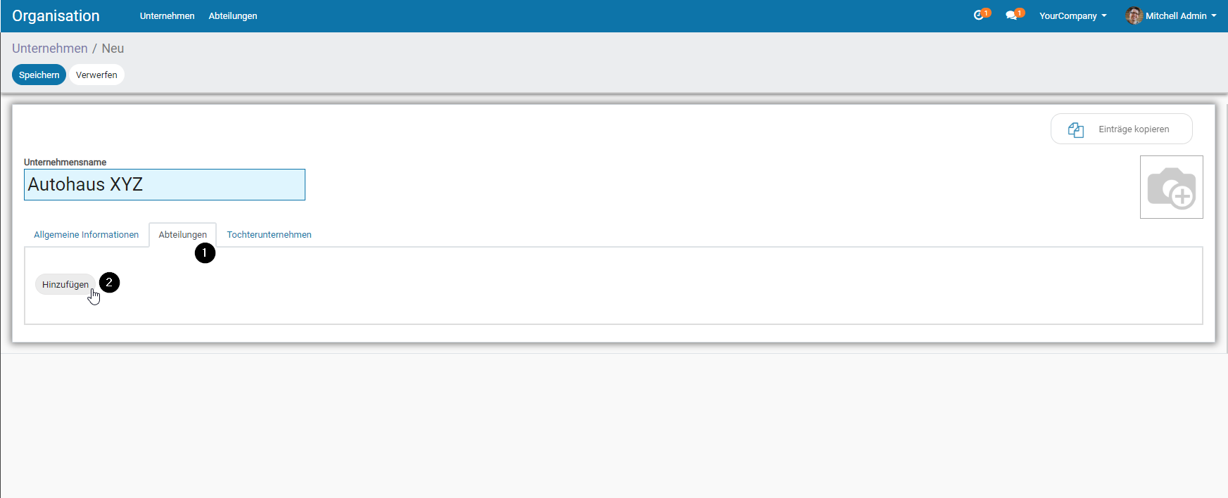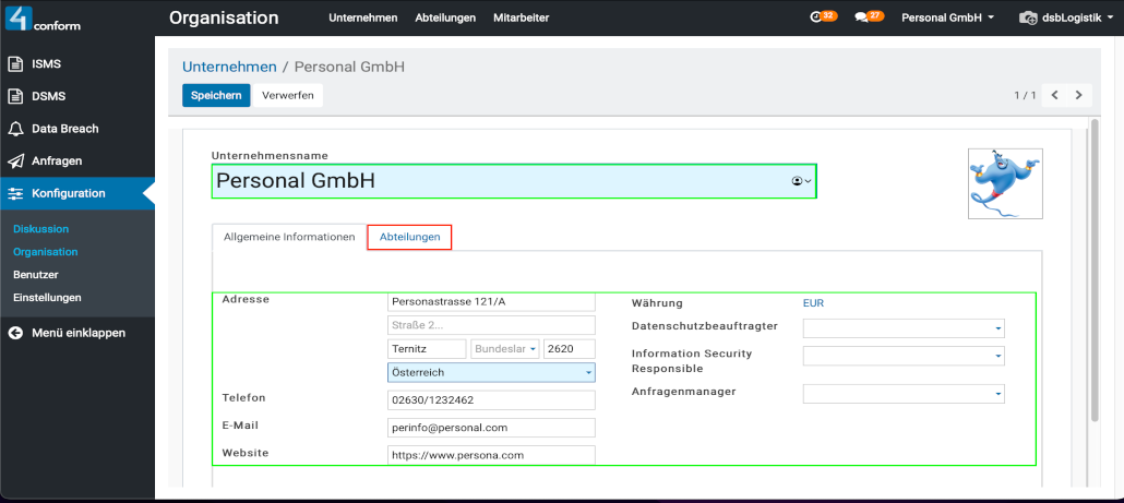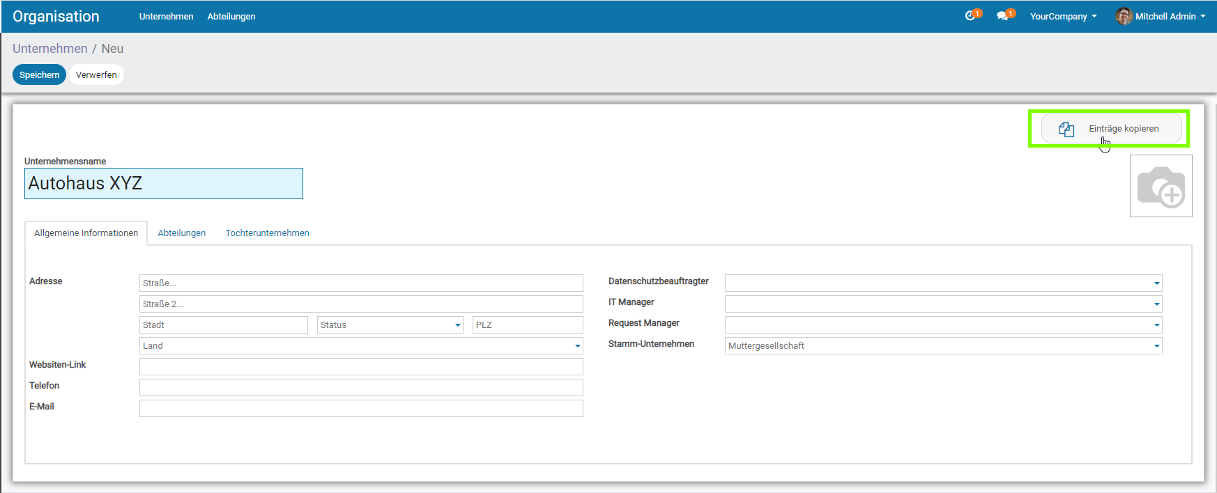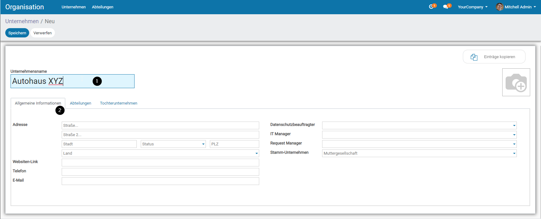 - Wurde der Bearbeitungsmodus aktiviert, können sie nun wichtige Informationen, ihres Unternehmens betreffend eintragen. Der „Unternehmensname“ ist wie das „Land“ verpflichtend einzutragen. Außerdem, können sie die „Adresse“ , „Telefonnummer„, „E-Mail„, „Website“ und die Verantwortlichen eintragen. Haben sie alle Einstellungen vorgenommen, können sie unter dem Reiter „Abteilungen„, die Konfiguration für die einzelnen Abteilungen, des Unternehmens, vornehmen.