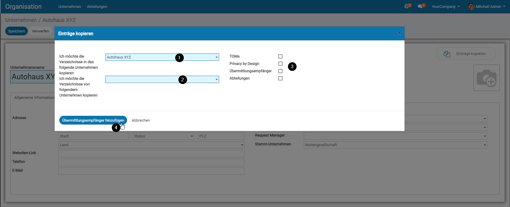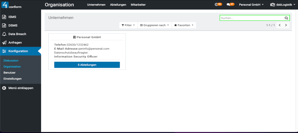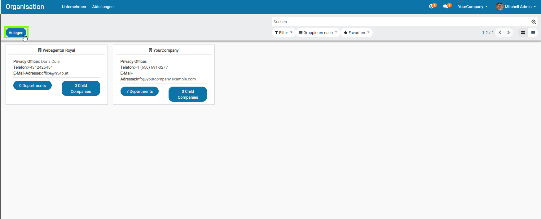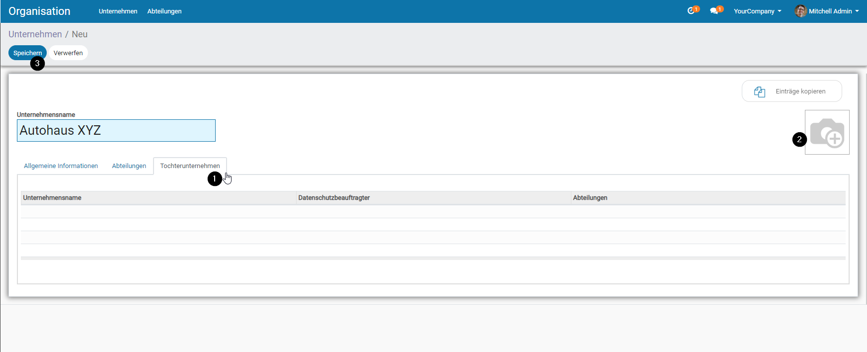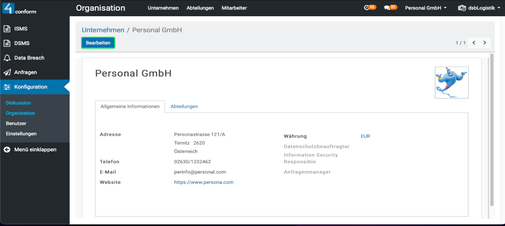 - Wurde der Bearbeitungsmodus aktiviert, können sie nun wichtige Informationen, ihres Unternehmens betreffend eintragen. Der „Unternehmensname“ ist wie das „Land“ verpflichtend einzutragen. Außerdem, können sie die „Adresse“ , „Telefonnummer„, „E-Mail„, „Website“ und die Verantwortlichen eintragen. Haben sie alle Einstellungen vorgenommen, können sie unter dem Reiter „Abteilungen„, die Konfiguration für die einzelnen Abteilungen, des Unternehmens, vornehmen.