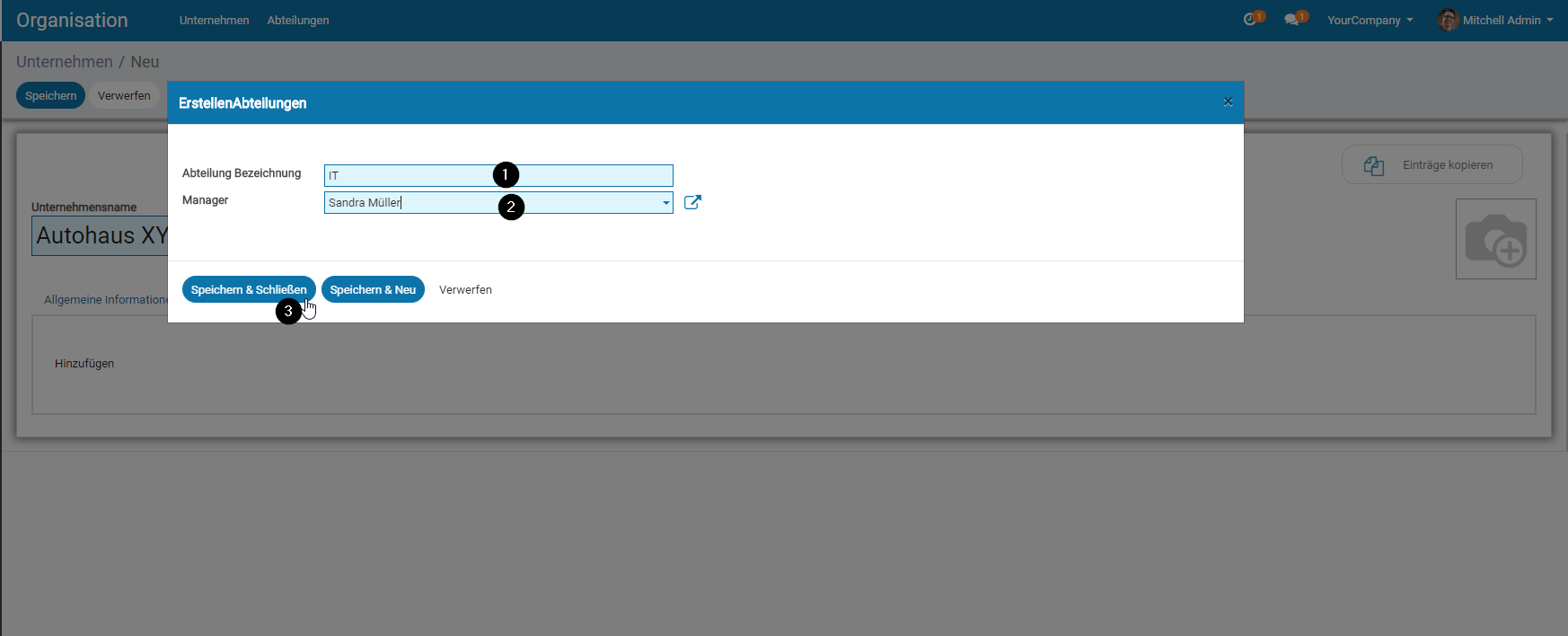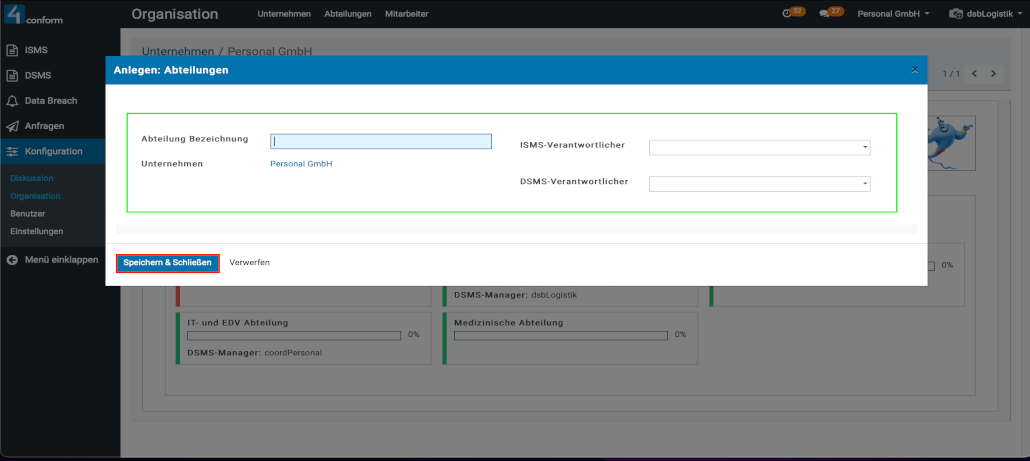 - Wenn sie unter Abteilungen, die Schaltfläche „Hinzufügen“ ausgewählt haben, erscheint ein neues Eingabe-Fenster, in dem sie alle wichtigen Informationen für die Abteilung eingeben können. Die „Bezeichnung der Abteilung“ ist hierbei Pflicht. Die Verantwortlichen, können zu jeder Zeit nachgetragen werden. Haben sie alles wichtige eingegeben, können sie die neue Abteilung durch auswählen der Schaltfläche „Speichern & Schließen„, ins System übernehmen.