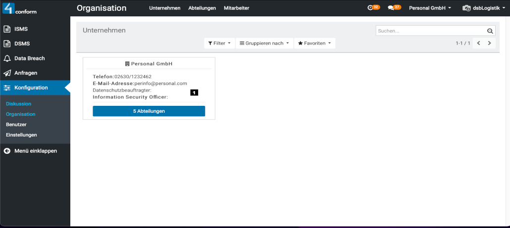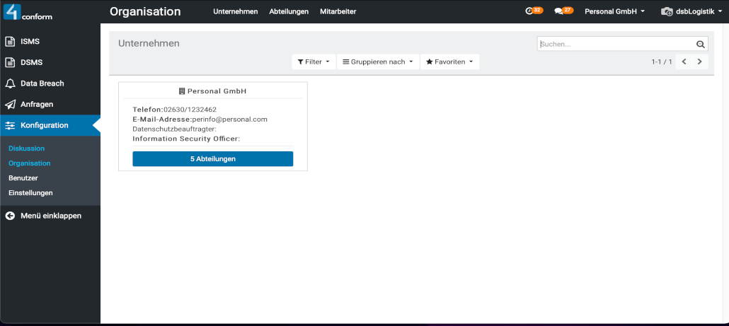 Der Punkt Organisation ermöglicht Ihnen, das Anlegen Ihres Unternehmens und der Abteilungen. Weiters können die Tochterunternehmen sowie das Personal des Unternehmens ebenfalls angelegt und der richtigen Abteilung zugewiesen werden.