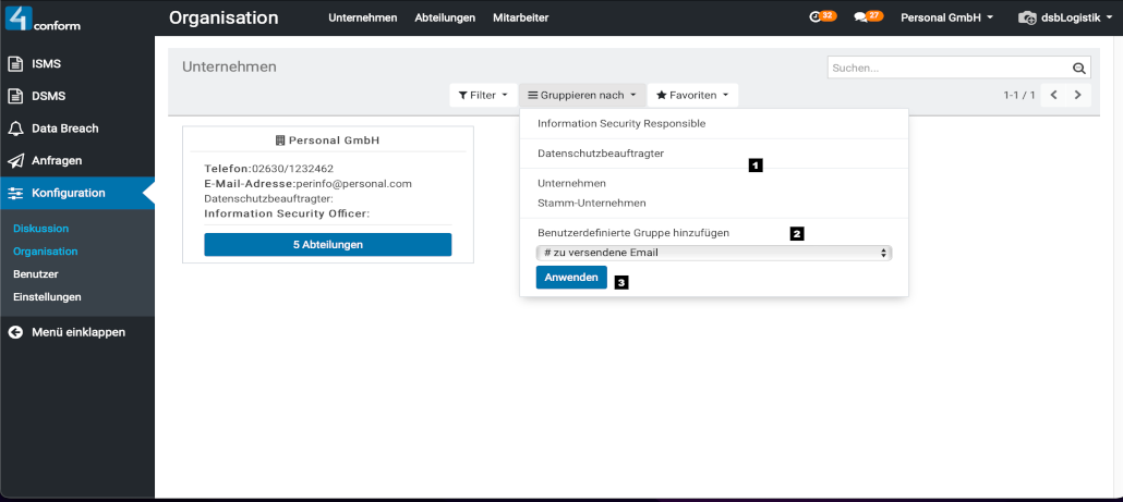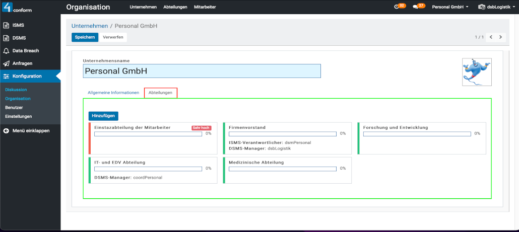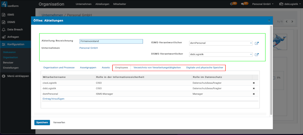 - Wurde eine Abteilung ausgewählt, erhalten sie hier die Möglichkeit, die einzelnen „Verantwortlichen“ für diese Abteilung nachzutragen und die „Bezeichnung der Abteilung“ zu ändern. Im unteren Bereich des neu erschienenen Fensters, erhalten sie eine Übersicht der „Mitarbeiter“ , der „Verzeichnisse von Verarbeitungstätigkeiten“ und die „Digitalen und physischen Speicher“ , welcher der Abteilung zugeordnet wurden. Die Übersichten con „Organisation und Prozesse“ , „Assetgruppen“ und „Assets“ , sind nur wichtig, wenn sie auch das Modul ISMS, installiert haben. Wurden alle Einstellungen vorgenommen und Informationen eingetragen, können sie diese Änderungen mit Auswahl der Schaltfläche „Speichern“ ins System übernehmen.