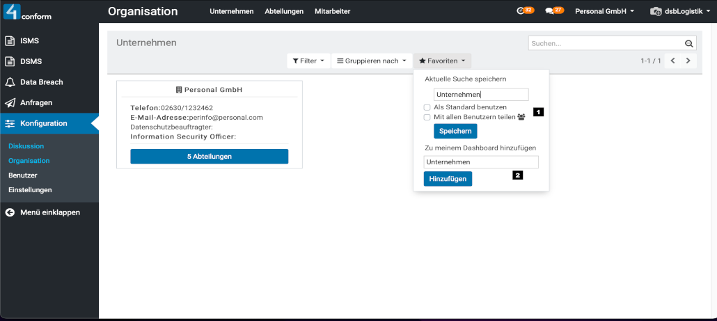 - Unter dem Menüpunkt „Favoriten“ , können sie ihre Suche speichern und festlegen, ob sie diese „als Standard benutzen“ möchten oder mit „allen Benutzern teilen“ möchten. Weiters können sie diese zu ihrem „eigenen Dashboard“ hinzufügen.